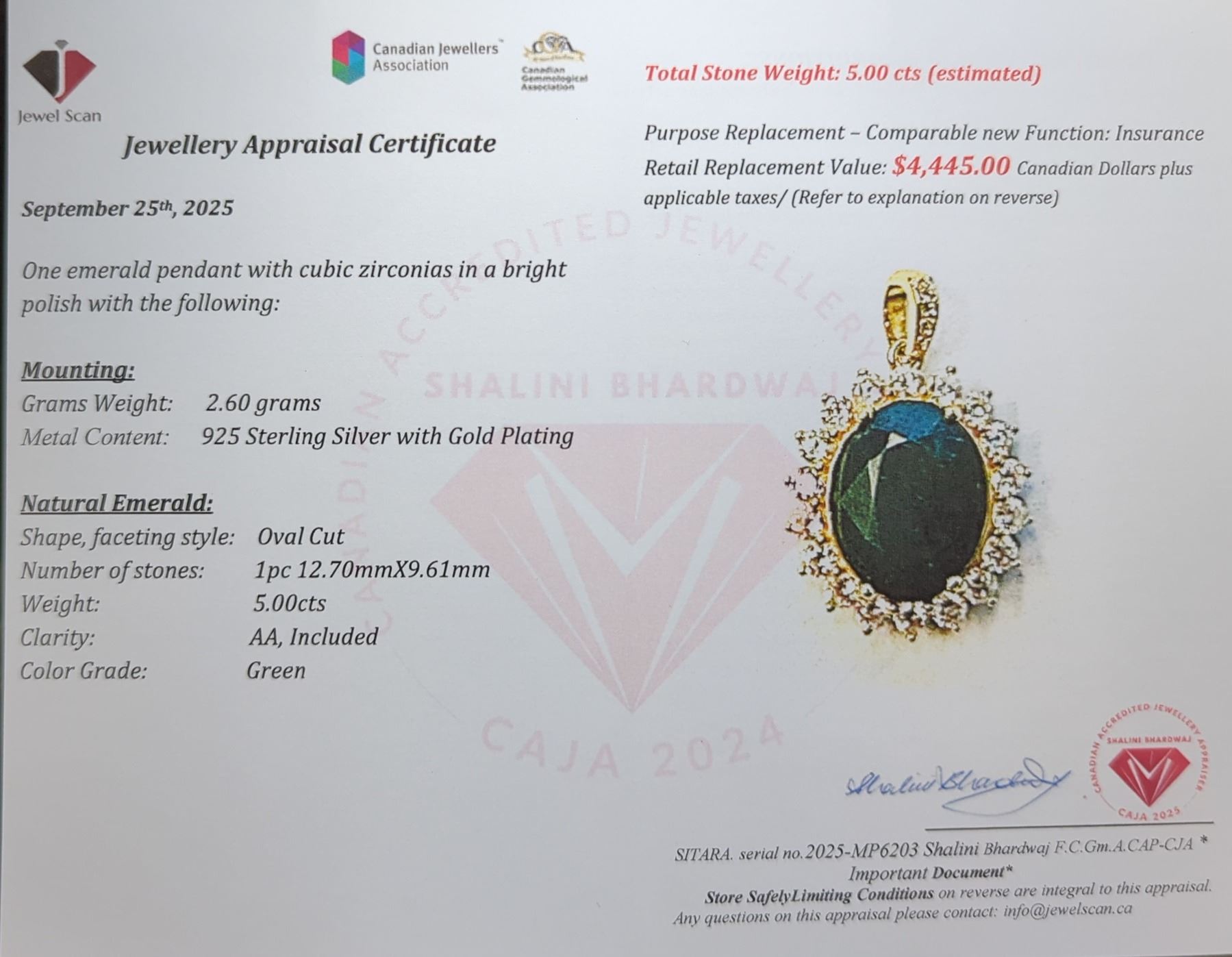 2.6 CT CERTIFIED SILVER EMERALD GEMSTONE PENDANT ($4,445 APPRAISAL, APPRAISAL NOT GUARANTEED)