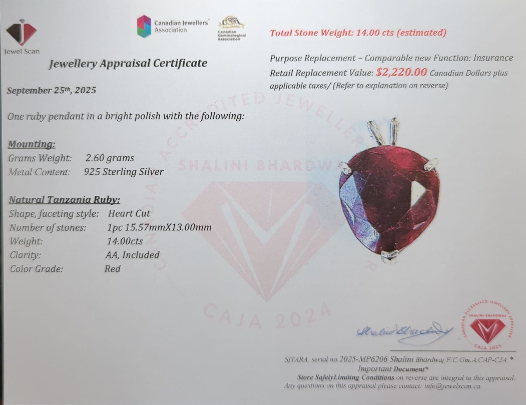 2.6 CT CERTIFIED SILVER RUBY GEMSTONE PENDANT ($2,220 APPRAISAL, APPRAISAL NOT GUARANTEED)