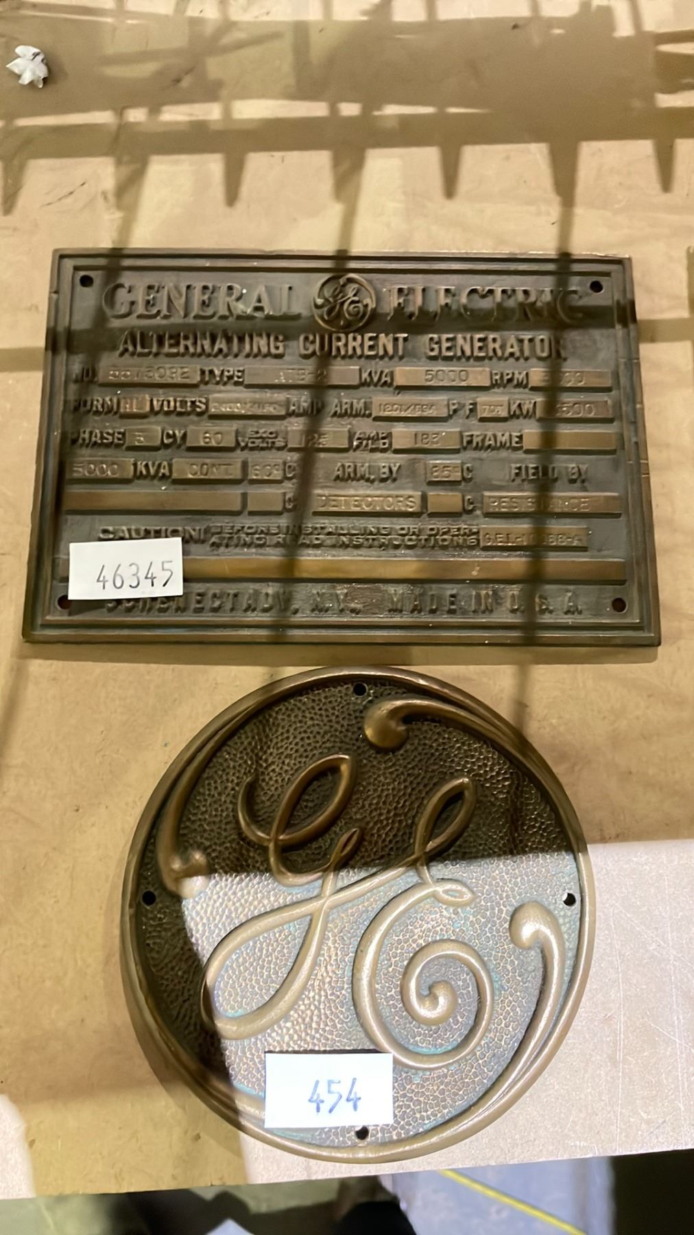 2 ANTIQUE GE BRASS PLATES