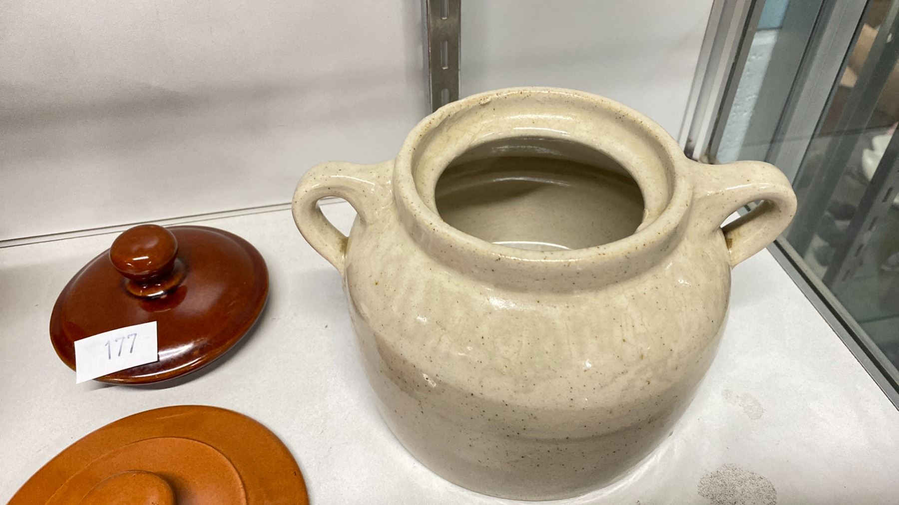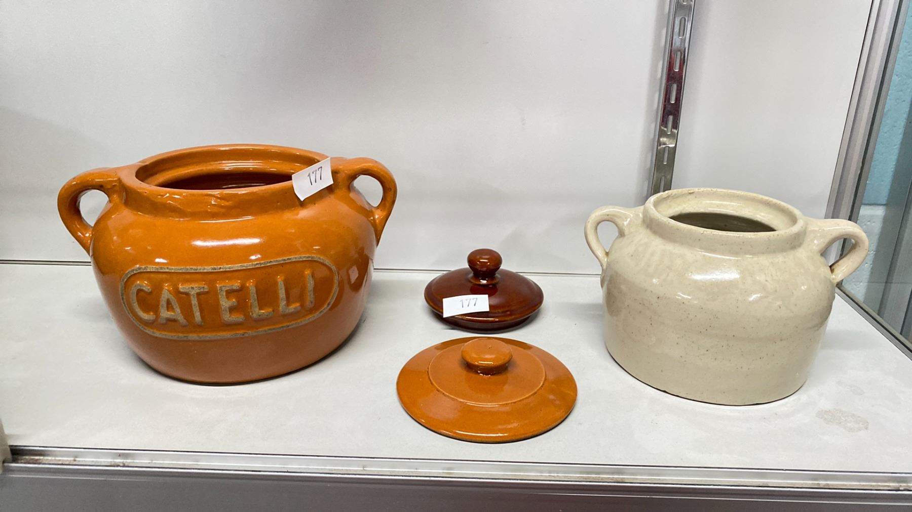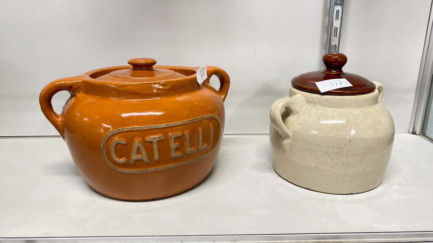 2 ANTIQUE MEDALTA STONEWARE BEAN POTS