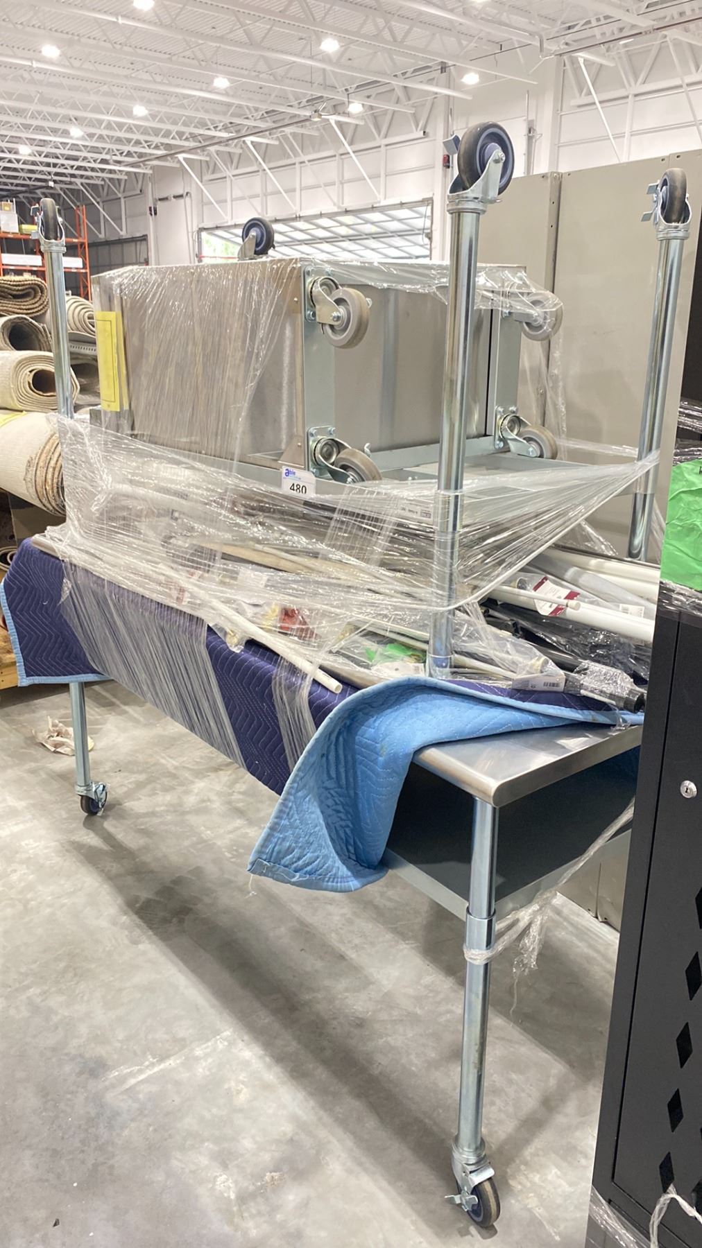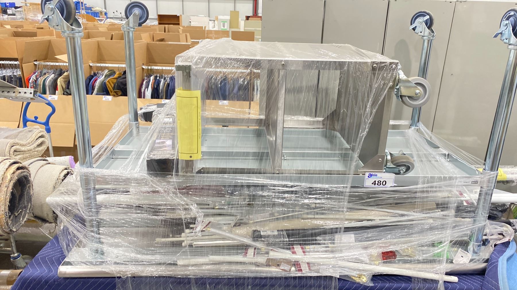 2 ASSORTED STAINLESS STEEL PORTABLE TABLES, STAINLESS STEEL PORTABLE RACK & MORE