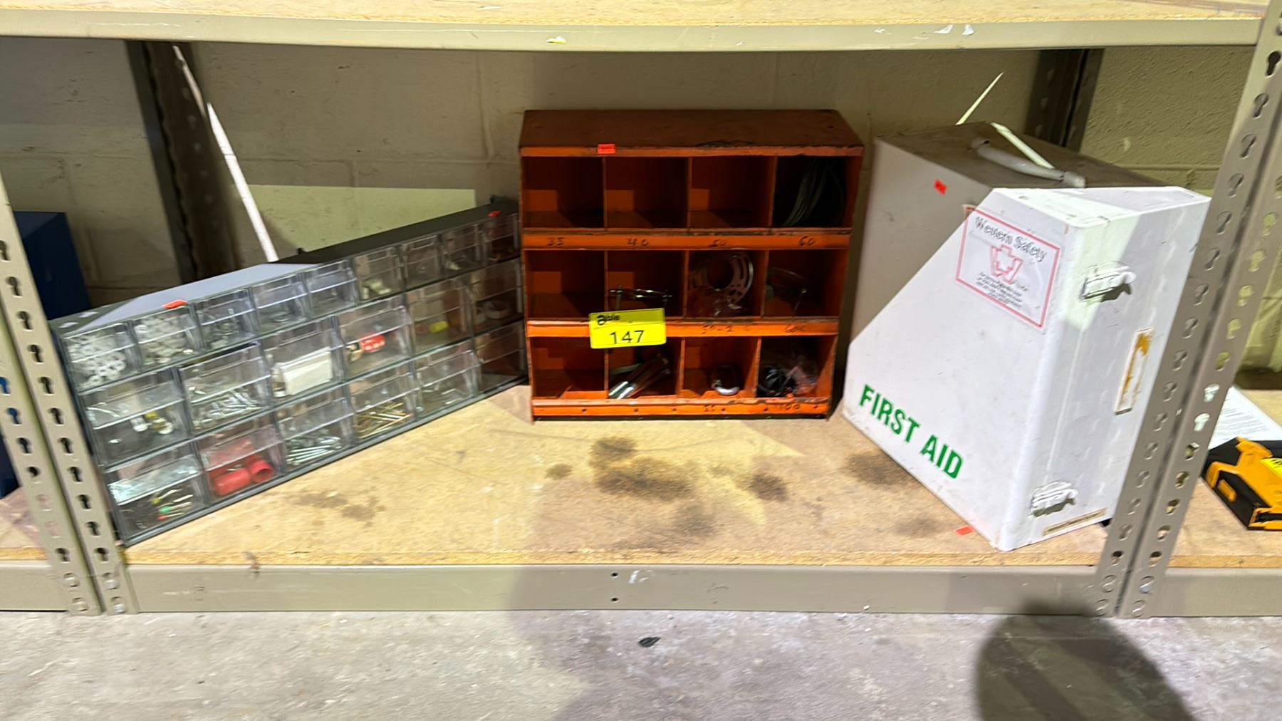2 ASSORTED TOOL ORGANIZERS WITH TOOL CONTENTS & METAL FIRST AID KIT WITH CONTENTS