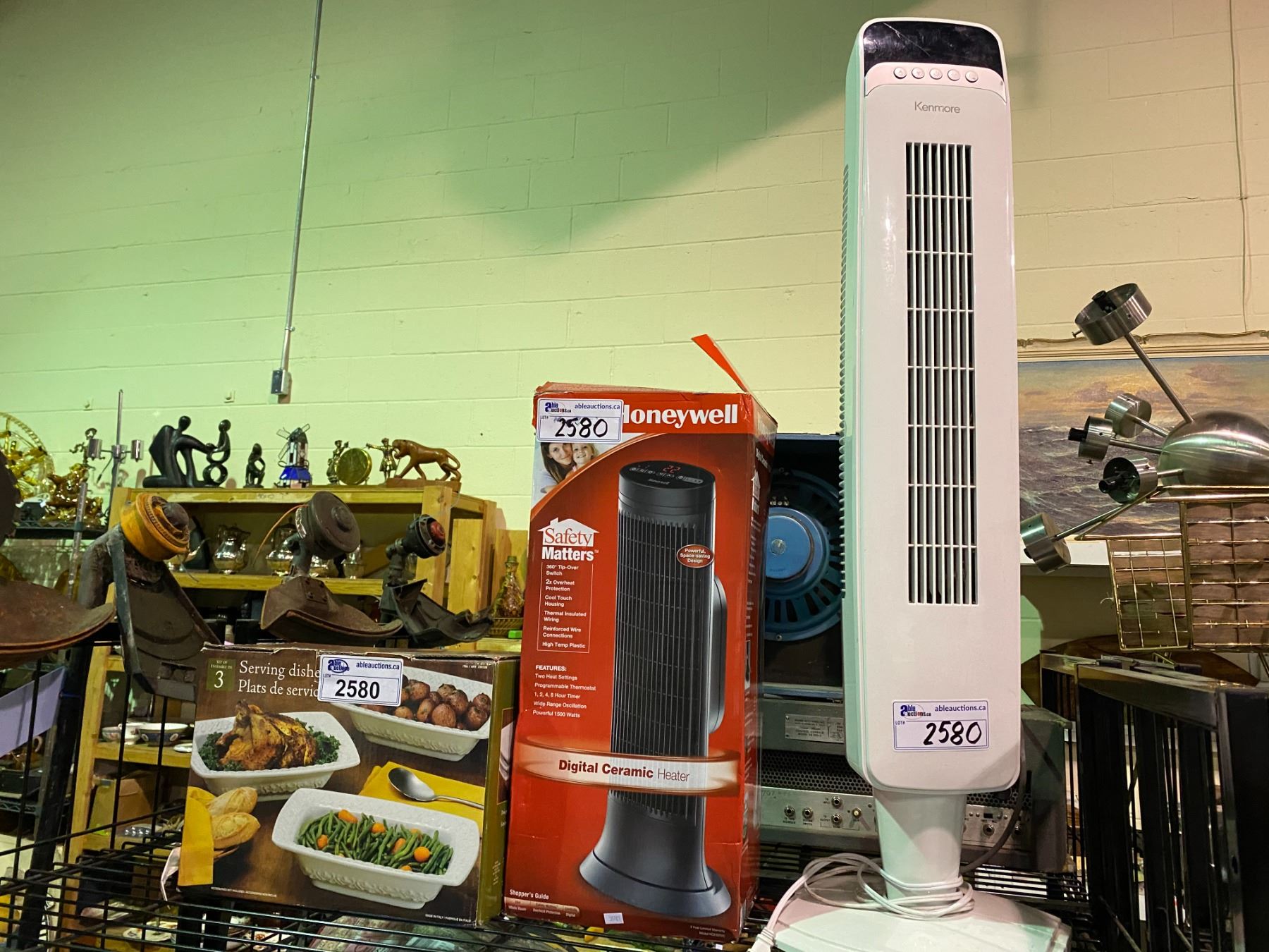 2 ASSORTED TOWER FANS, AND SERVING DISHES
