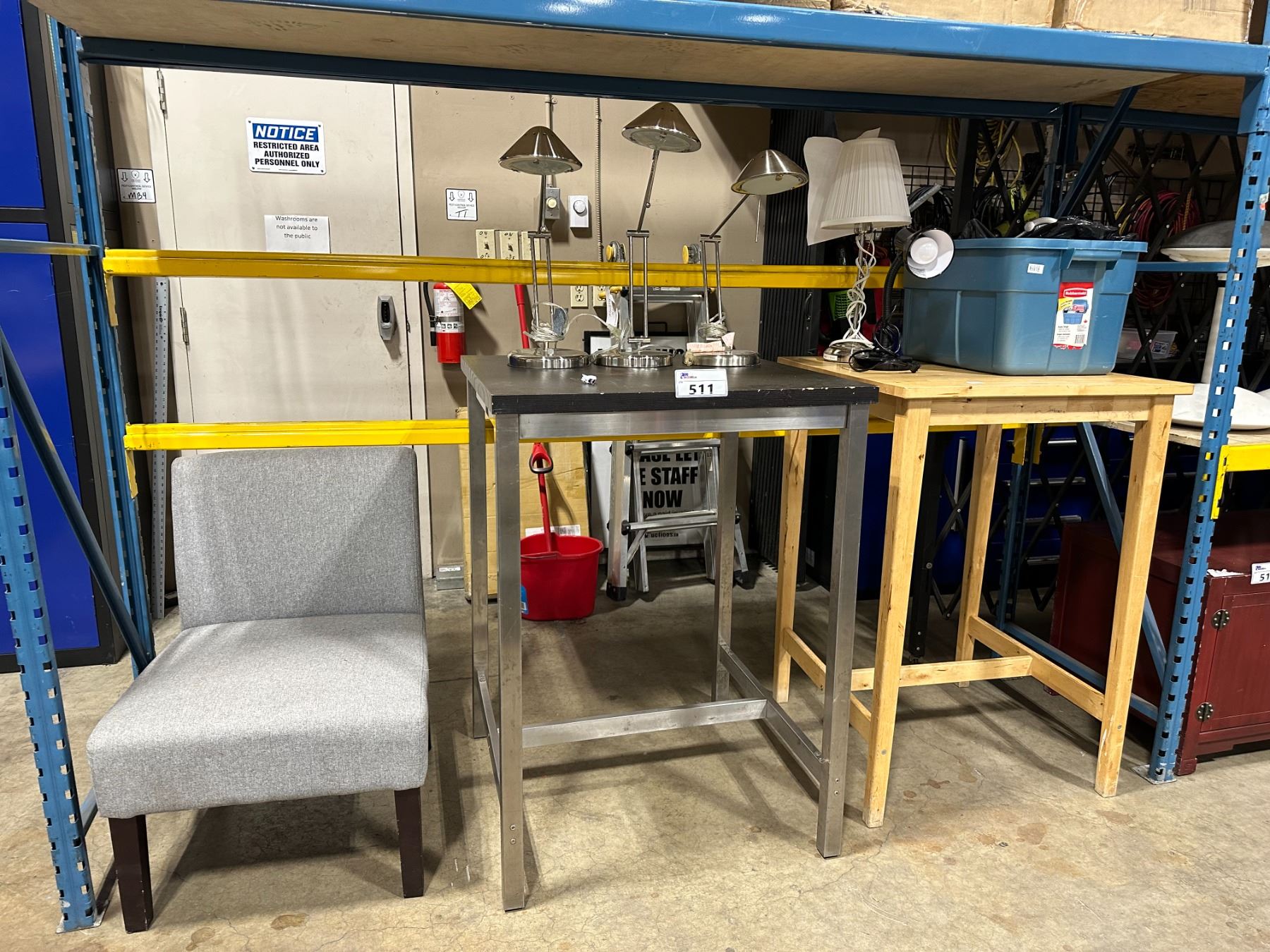 2 BAR HEIGHT TABLES, GREY CHAIR & ASSORTED TABLE LAMPS