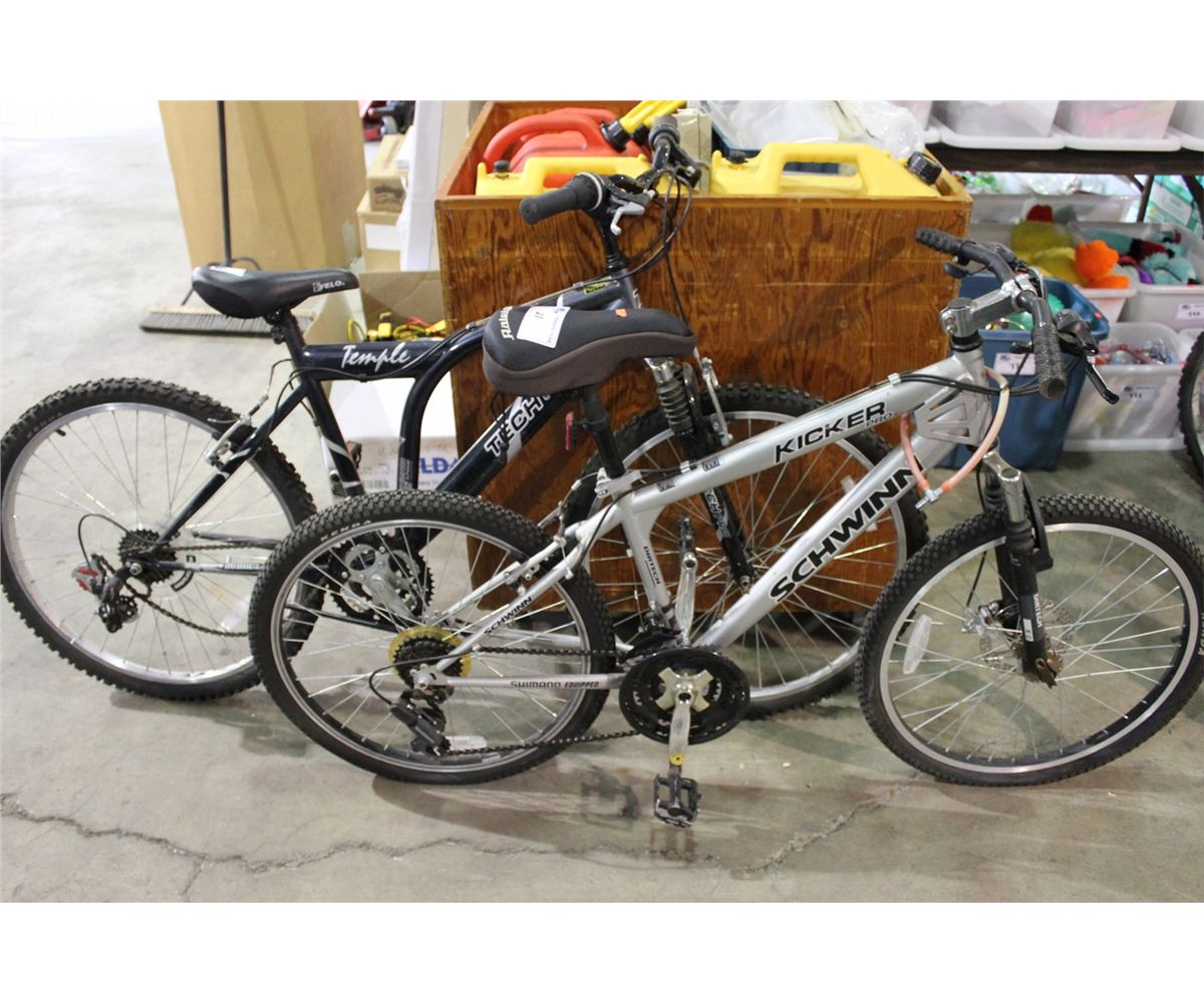 2 BIKES: BLACK TECHPRO FRONT SUSPENSION MOUNTAIN BIKE & SILVER SCHWINN FRONT SUSPENSION MOUNTAIN BIKE