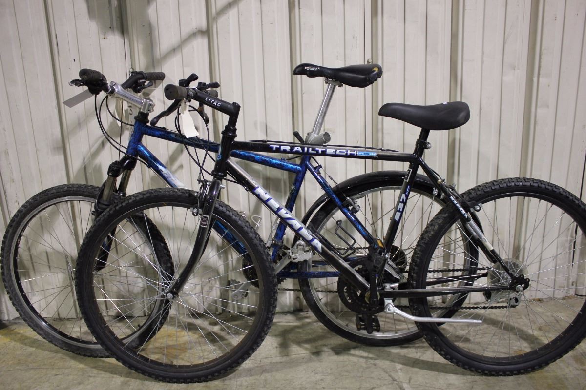 2 BIKES: BLUE NISHIKI EXPEDITION 21 SPEED FRONT SUSPENSION MOUNTAIN BIKE & GREY NEVADA TRAILTECH 15 SPEED MOUNTAIN BIKE