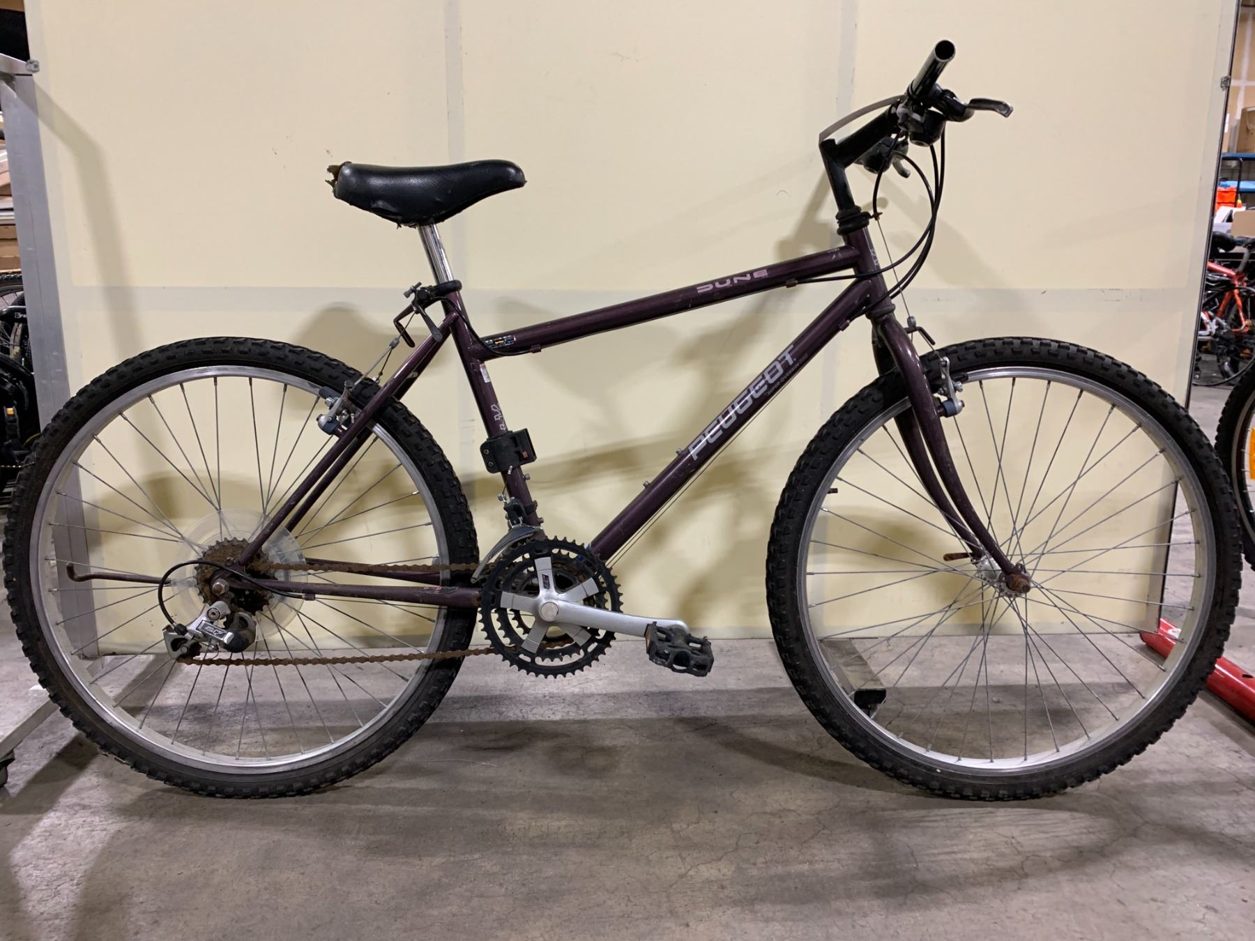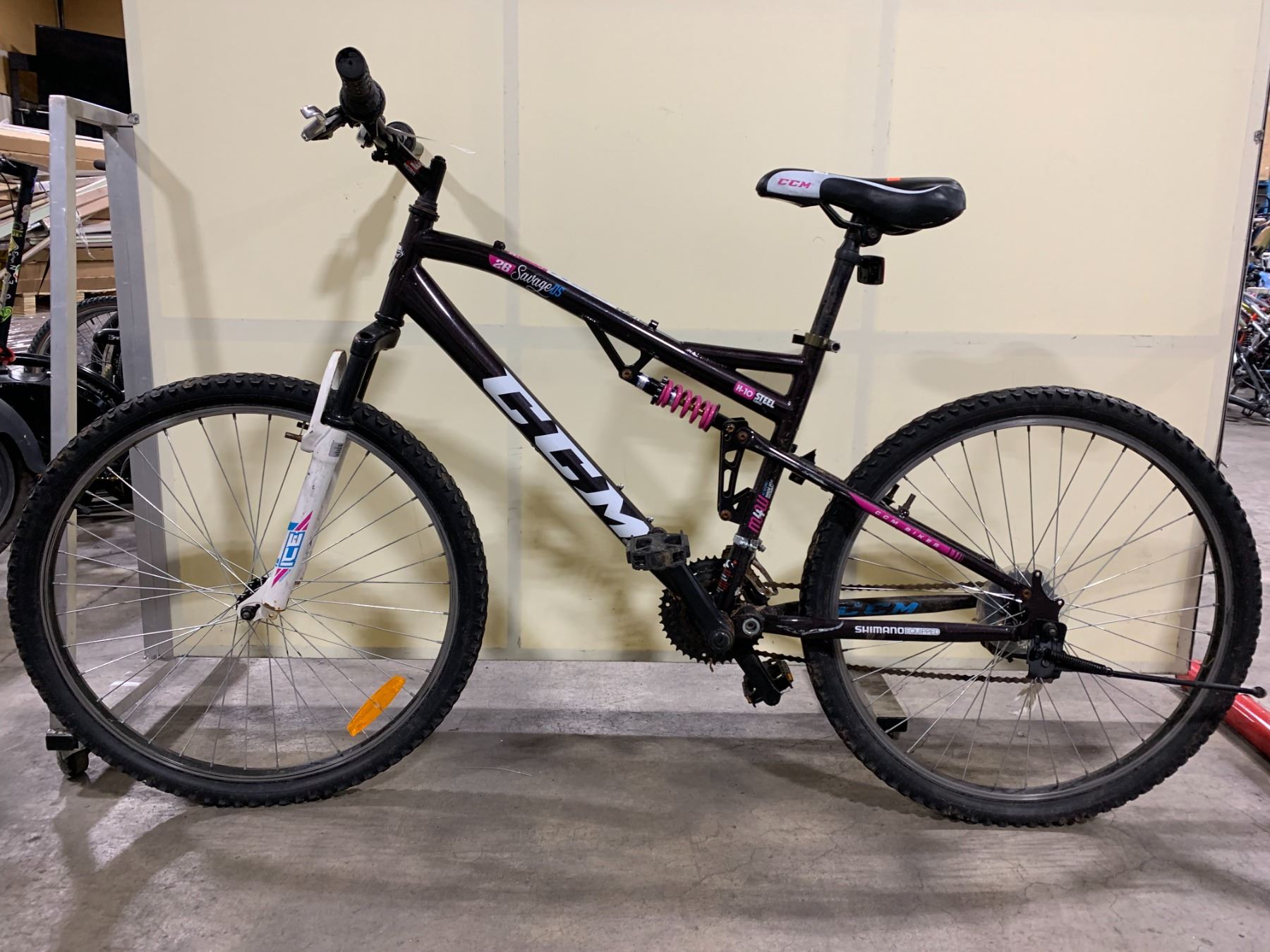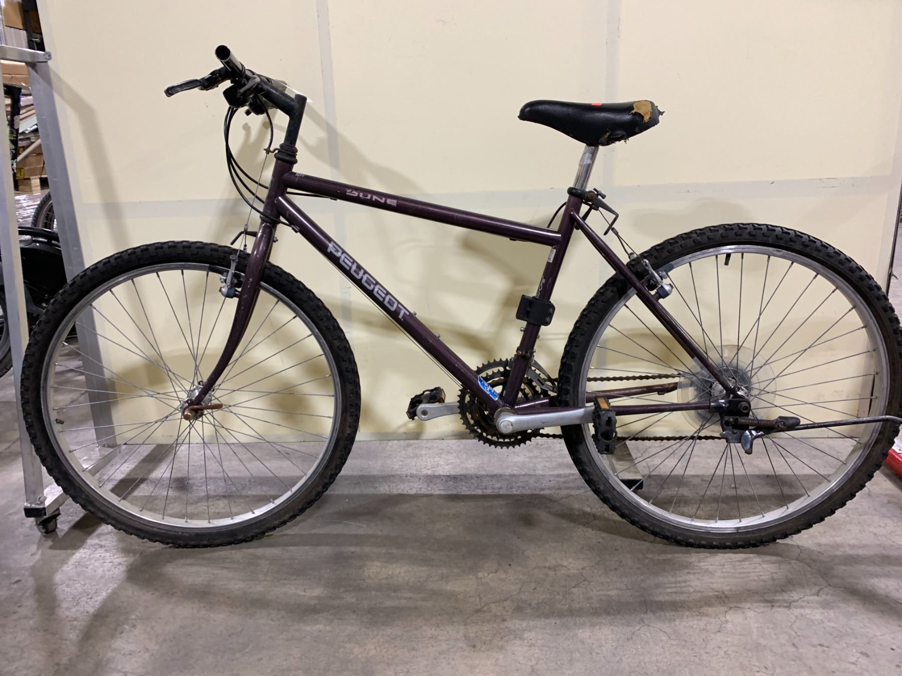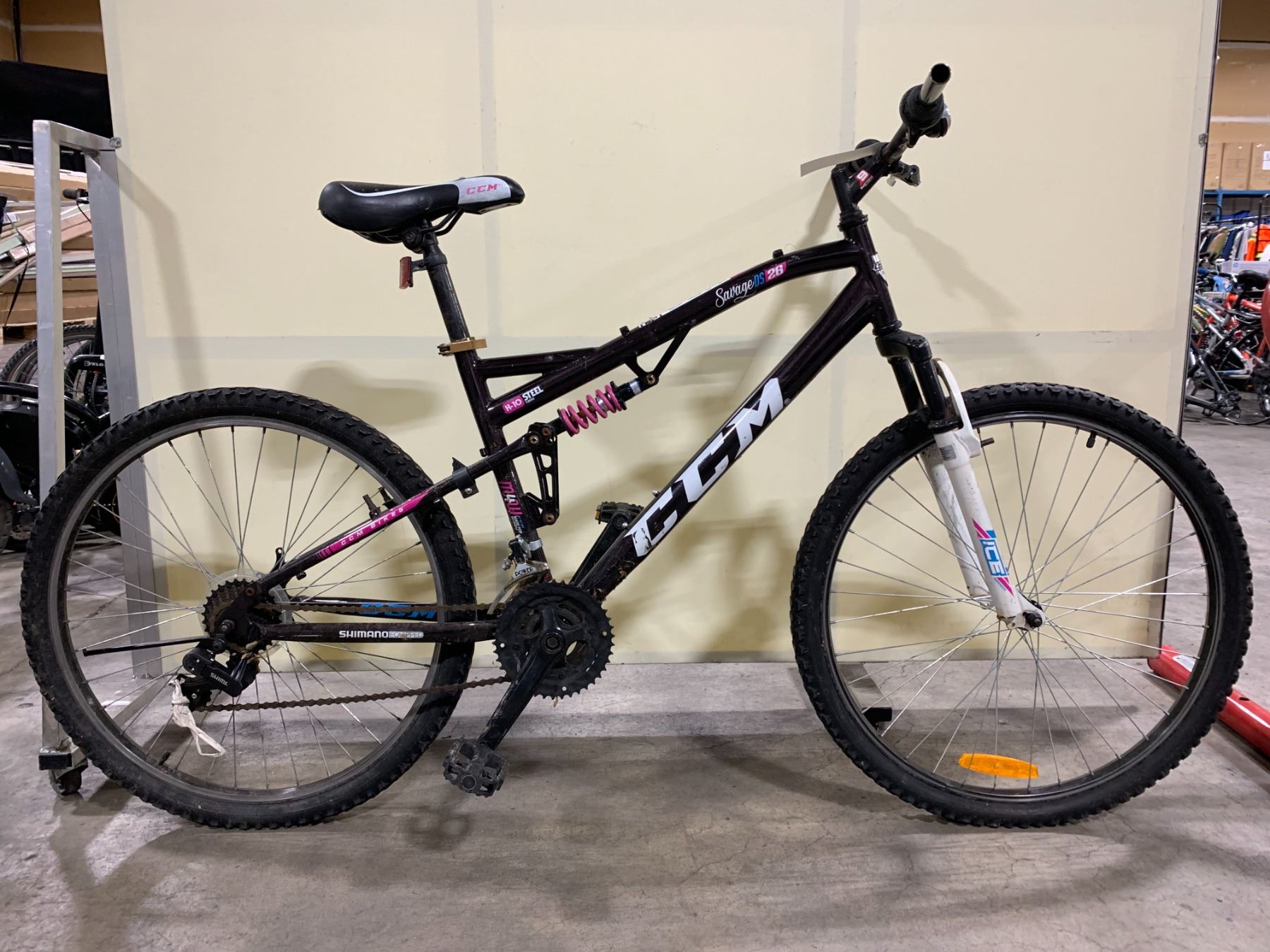 2 BIKES: CCM SAVAGE DS BLACK 21 SPEED FULL SUSPENSION MOUNTAIN BIKE & PEUGEOT DUNE PURPLE 21 SPEED MOUNTAIN BIKE *BOTH MISSING HANDLE GRIPS*