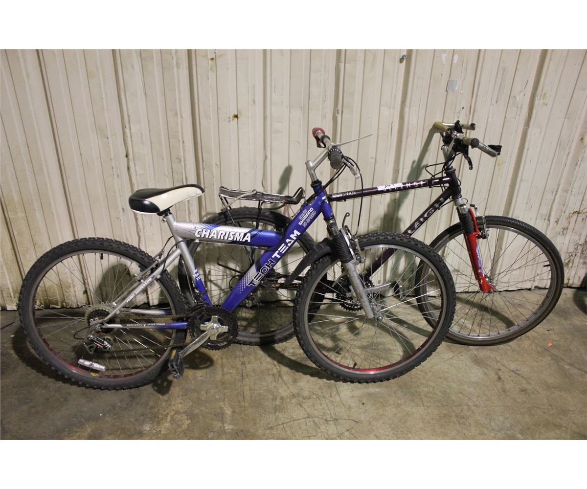 2 BIKES: PURPLE RALEIGH FRONT SUSPENSION & BLUE TECH TEAM FRONT SUSPENSION MOUNTAIN BIKE