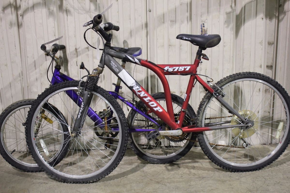 2 BIKES: RED DUNLOP 21 SPEED FRONT SUSPENSION MOUNTAIN BIKE & PURPLE NO NAME 15 SPEED MOUNTAIN BIKE