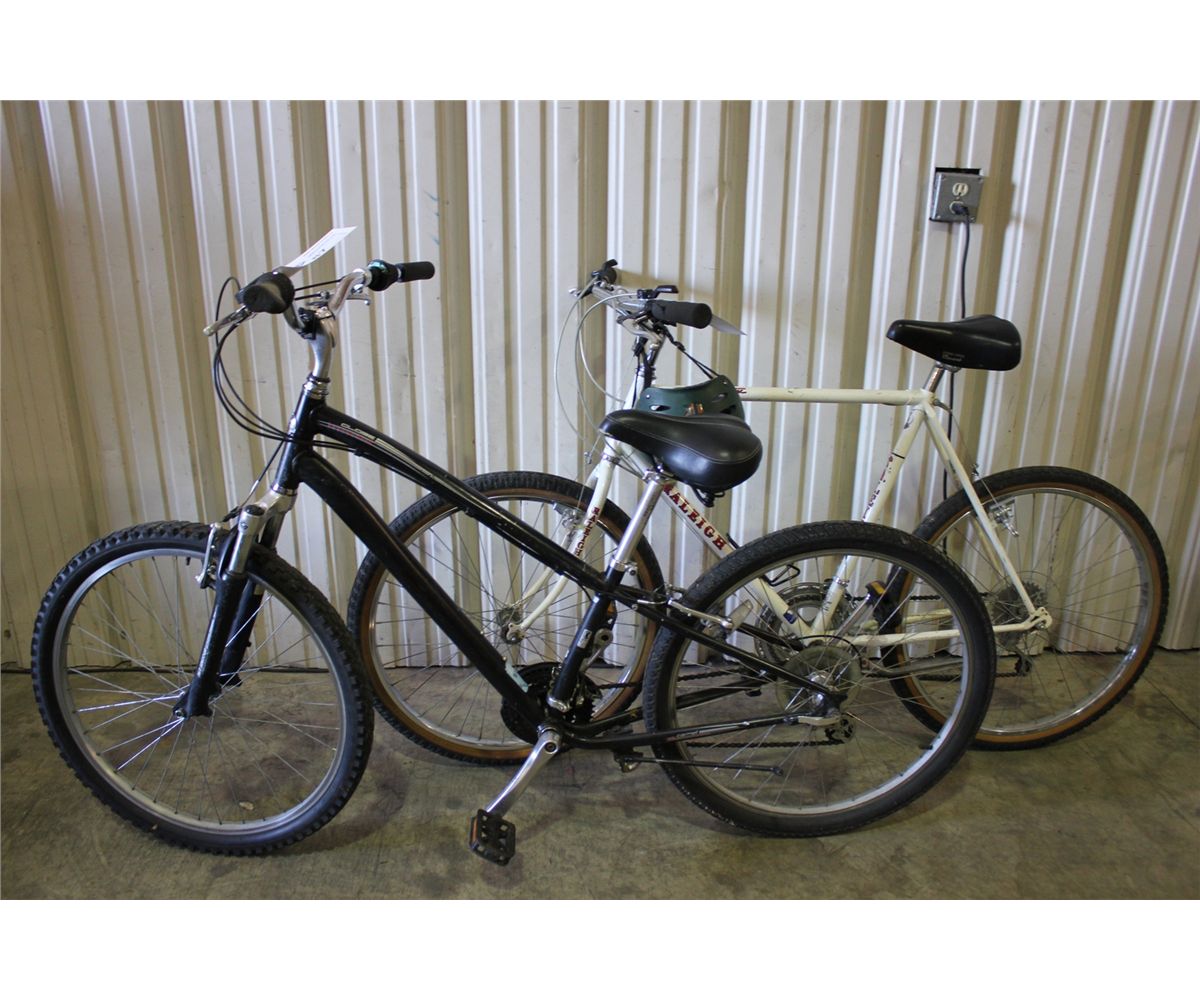 2 BIKES: WHITE RALEIGH 12 SPEED MOUNTAIN BIKE & BLACK GLOBE 21 SPEED FRONT SUSPENSION MOUNTAIN BIKE