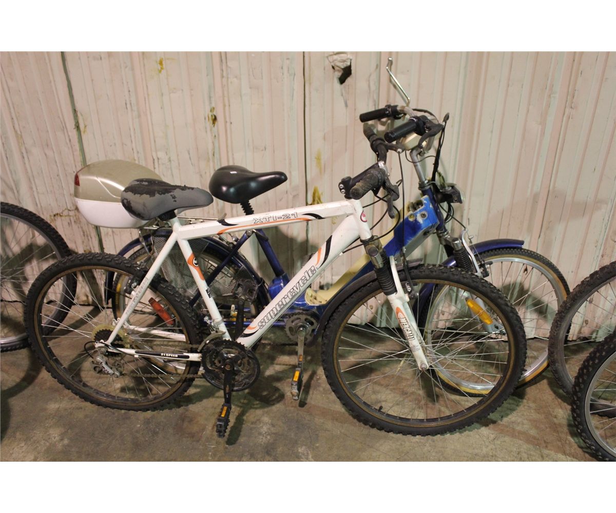 2 BIKES: WHITE SUPERCYCLE FRONT SUSPENSION & BLUE NO NAME FRONT SUSPENSION ELECTRIC BIKE ( NO BATTERY)
