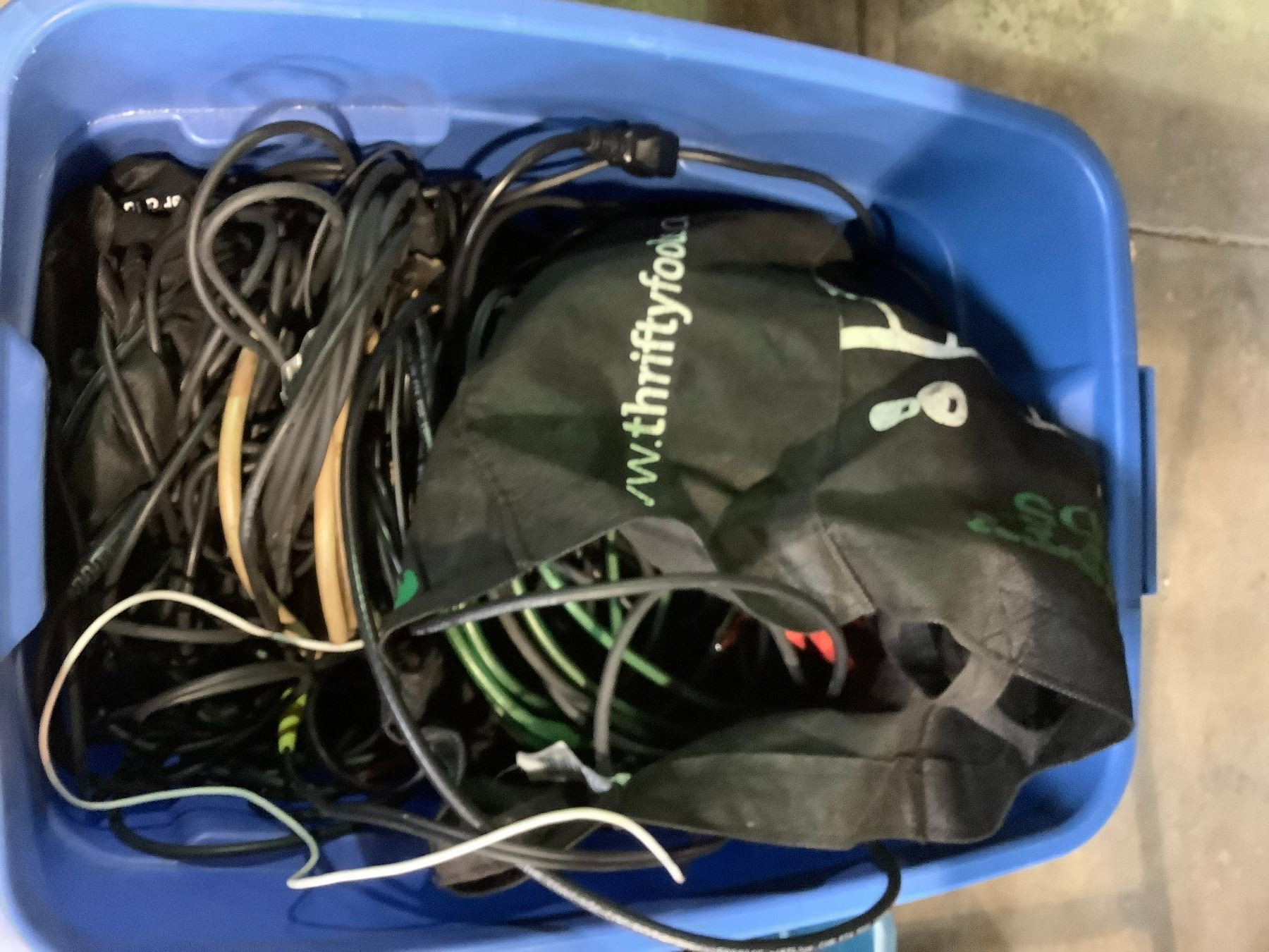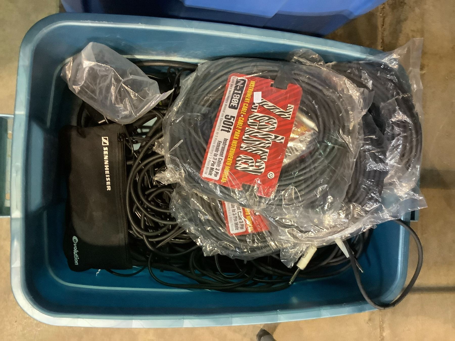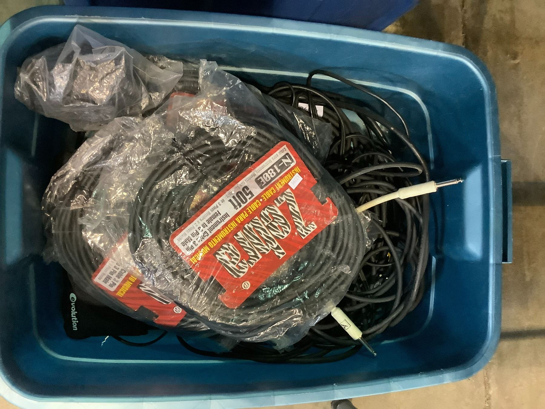 2 BINS OF ASSORTED AUDIO CABLES INCLUDING; 3 PIN INSTRUMENT CABLES, GUITAR CABLES, POWER CABLES