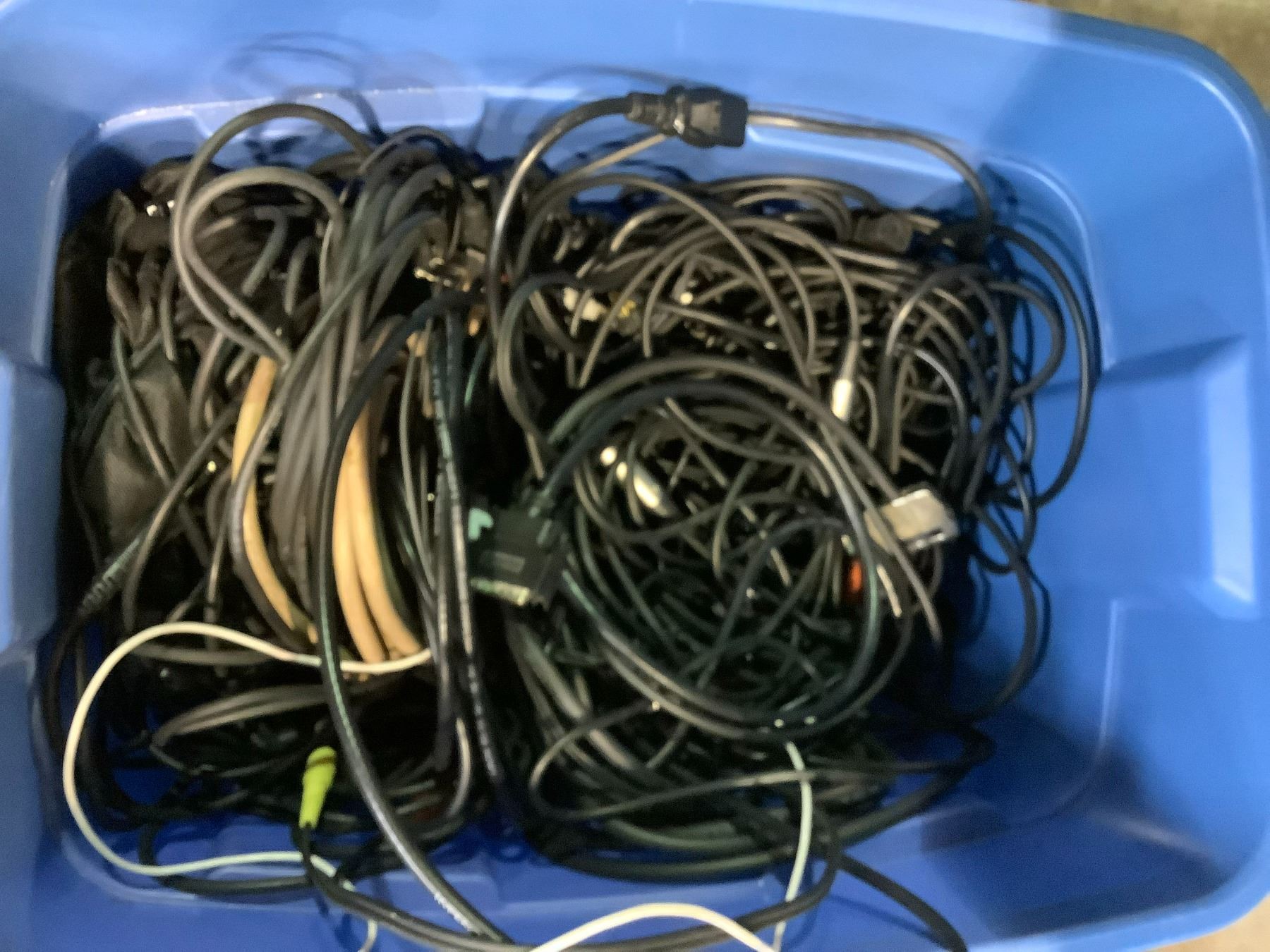 2 BINS OF ASSORTED AUDIO CABLES INCLUDING; 3 PIN INSTRUMENT CABLES, GUITAR CABLES, POWER CABLES & MORE