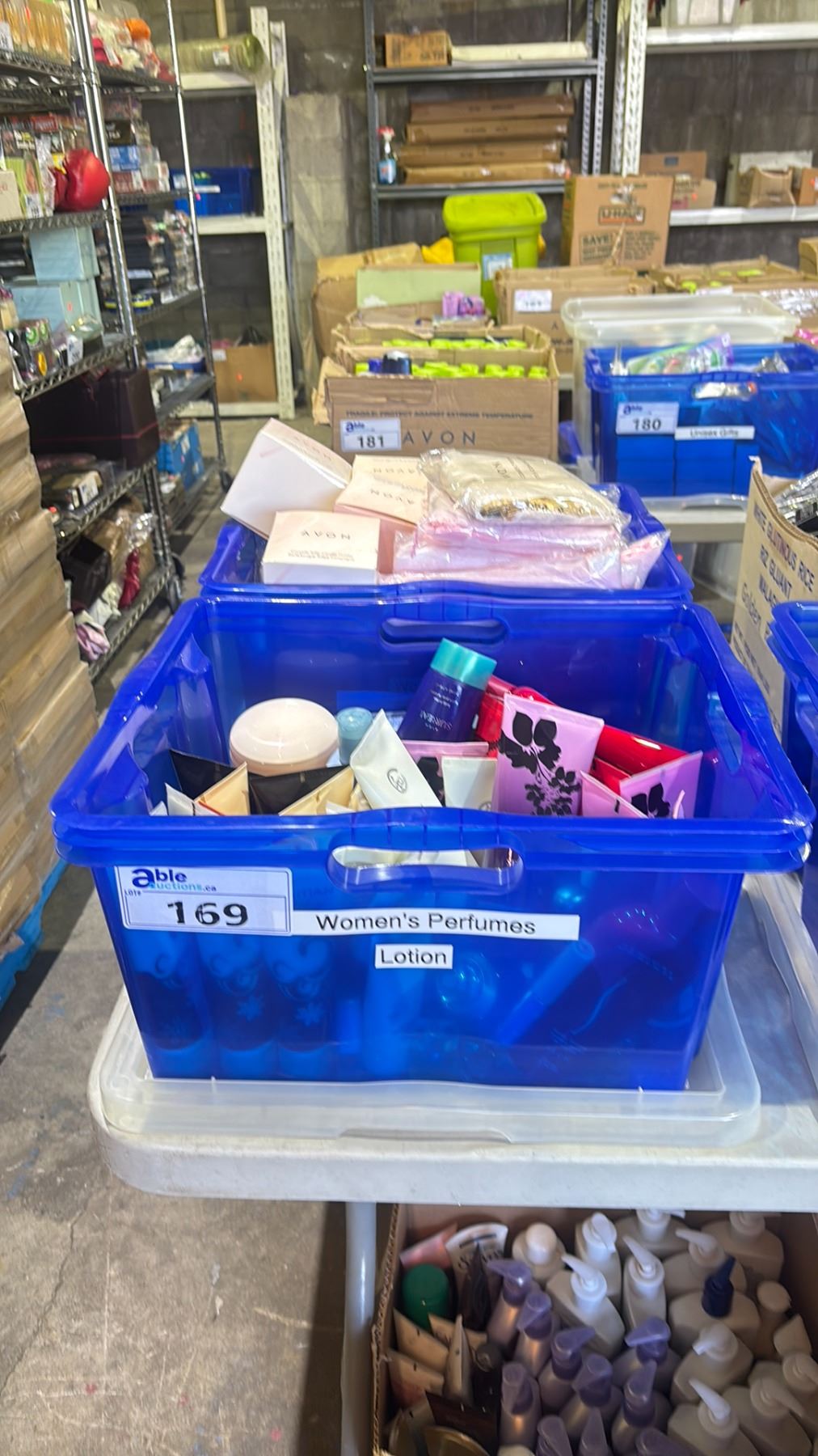 2 BINS OF ASSORTED AVON COSMETICS INCLUDING BODY LOTION, PERFUME, COSMETIC POUCHES, SCARVES, CANDLE