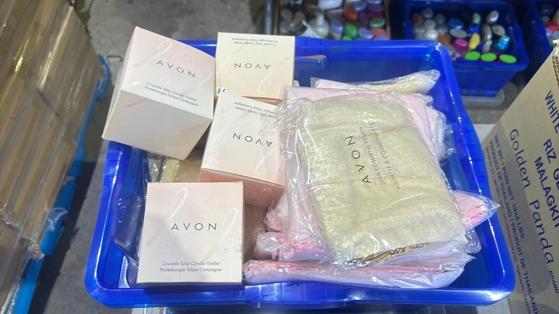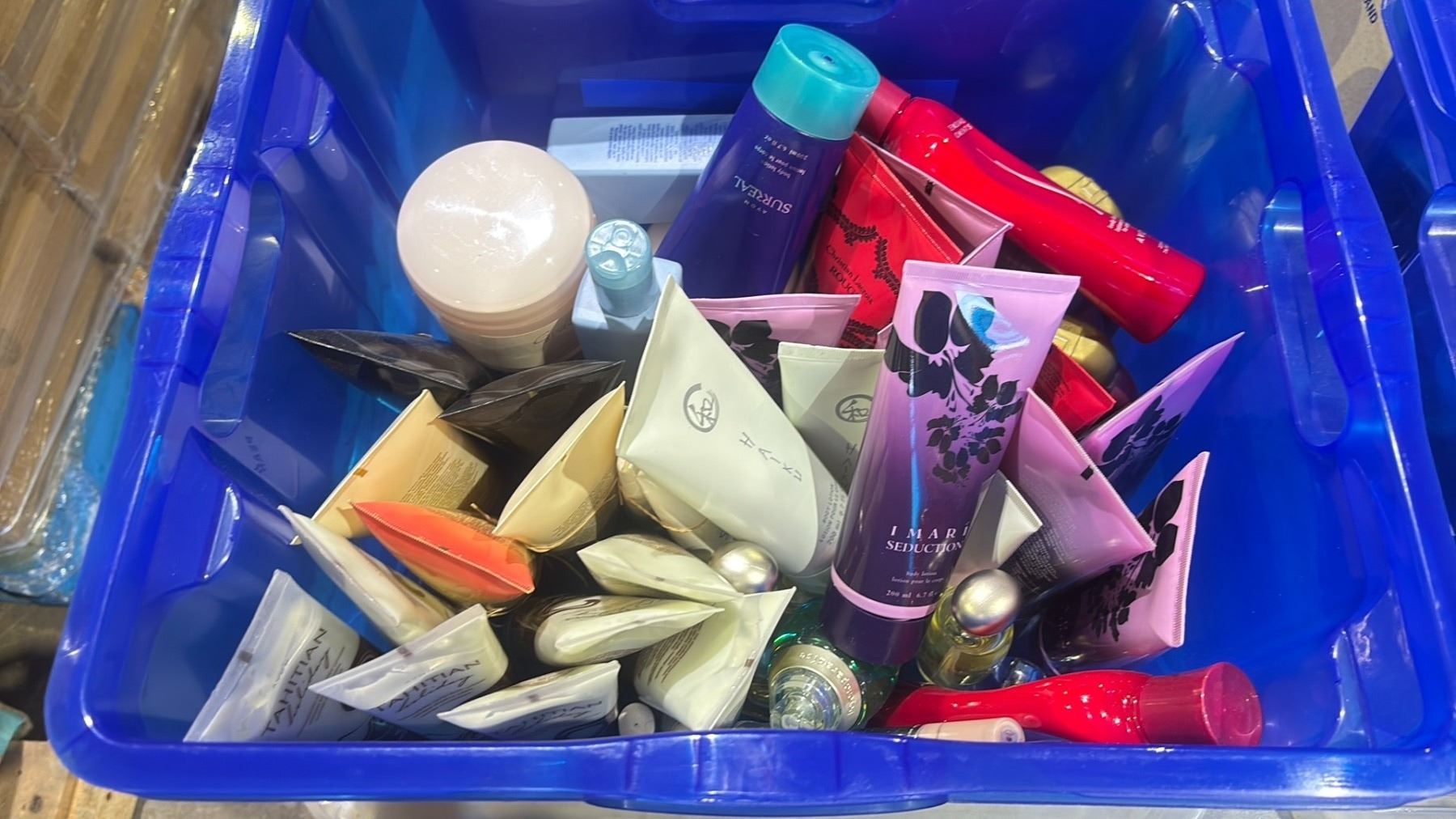 2 BINS OF ASSORTED AVON COSMETICS INCLUDING BODY LOTION, PERFUME, COSMETIC POUCHES, SCARVES, CANDLE HOLDERS & MORE