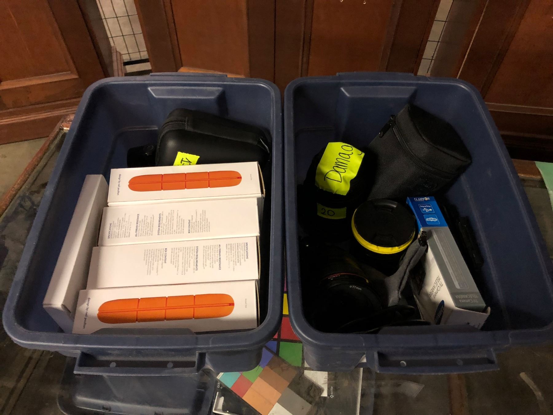 2 BINS OF ASSORTED CAMERA EQUIPMENT/HD'S