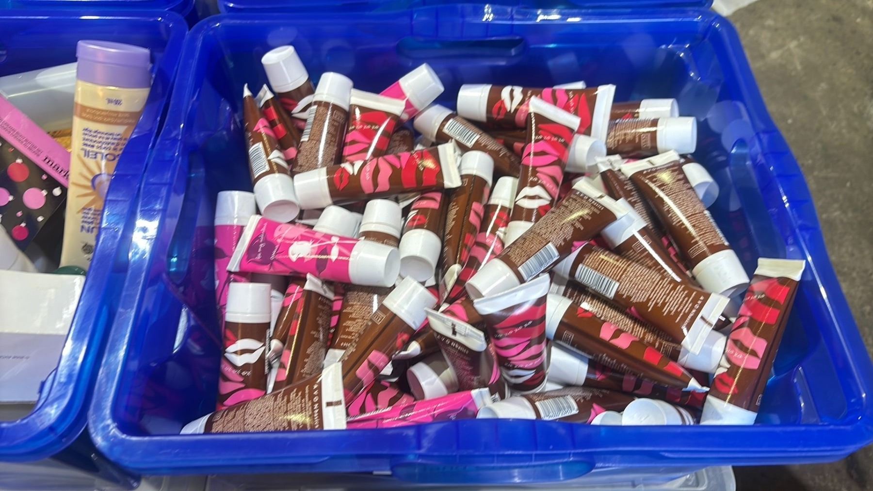 2 BINS OF ASSORTED COSMETICS INCLUDING AVON HAND CREAM, ANEW FACE CREAMS, AVON/ODYSSEY PERFUME,