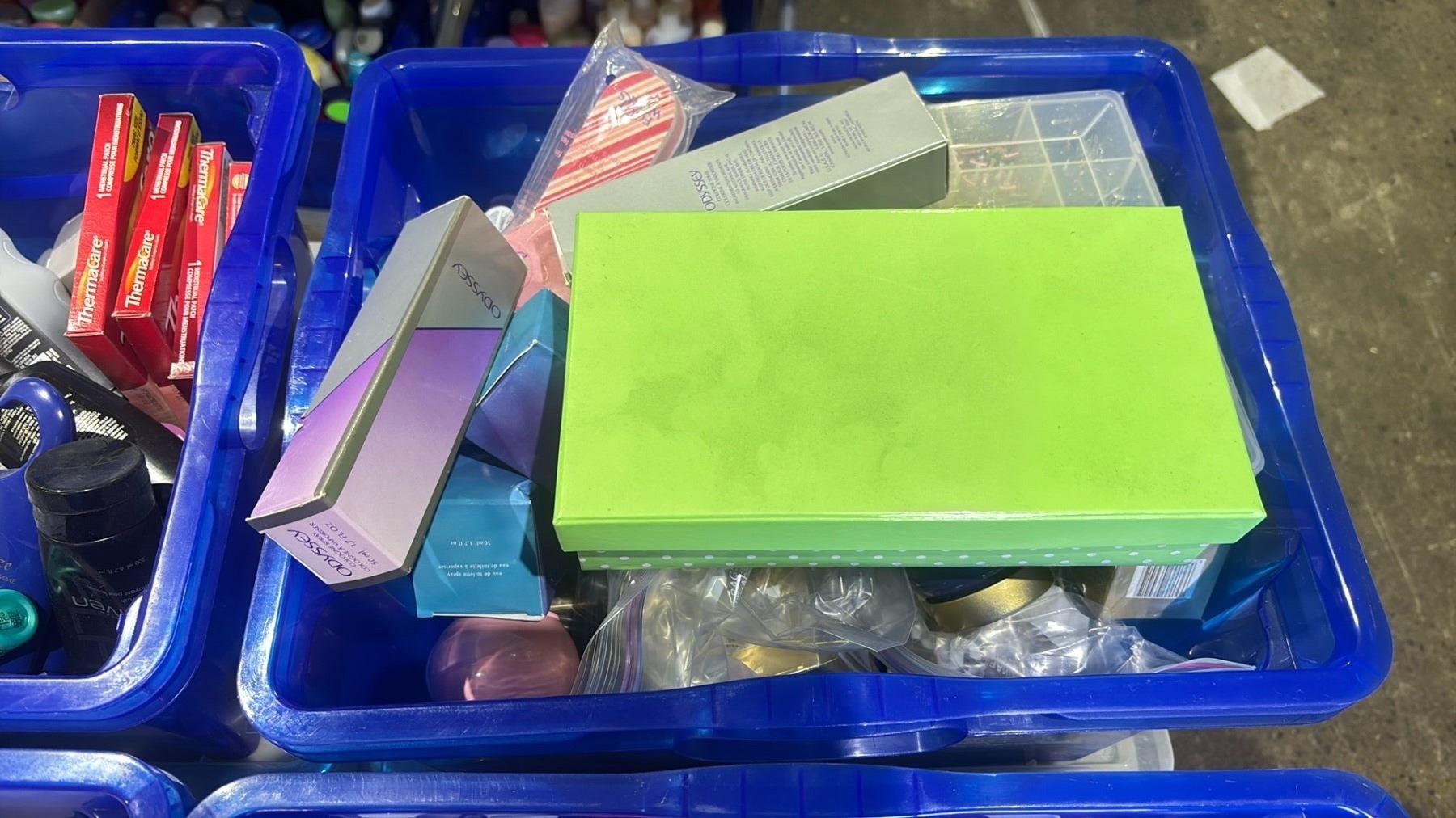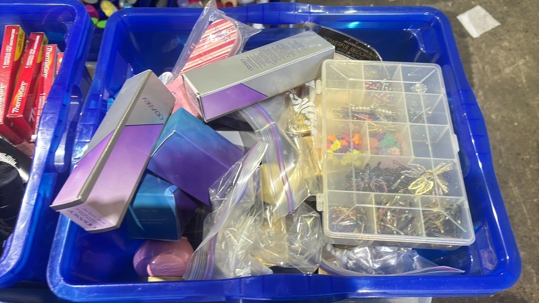 2 BINS OF ASSORTED COSMETICS INCLUDING AVON HAND CREAM, ANEW FACE CREAMS, AVON/ODYSSEY PERFUME, HAIR CLIPS & MORE