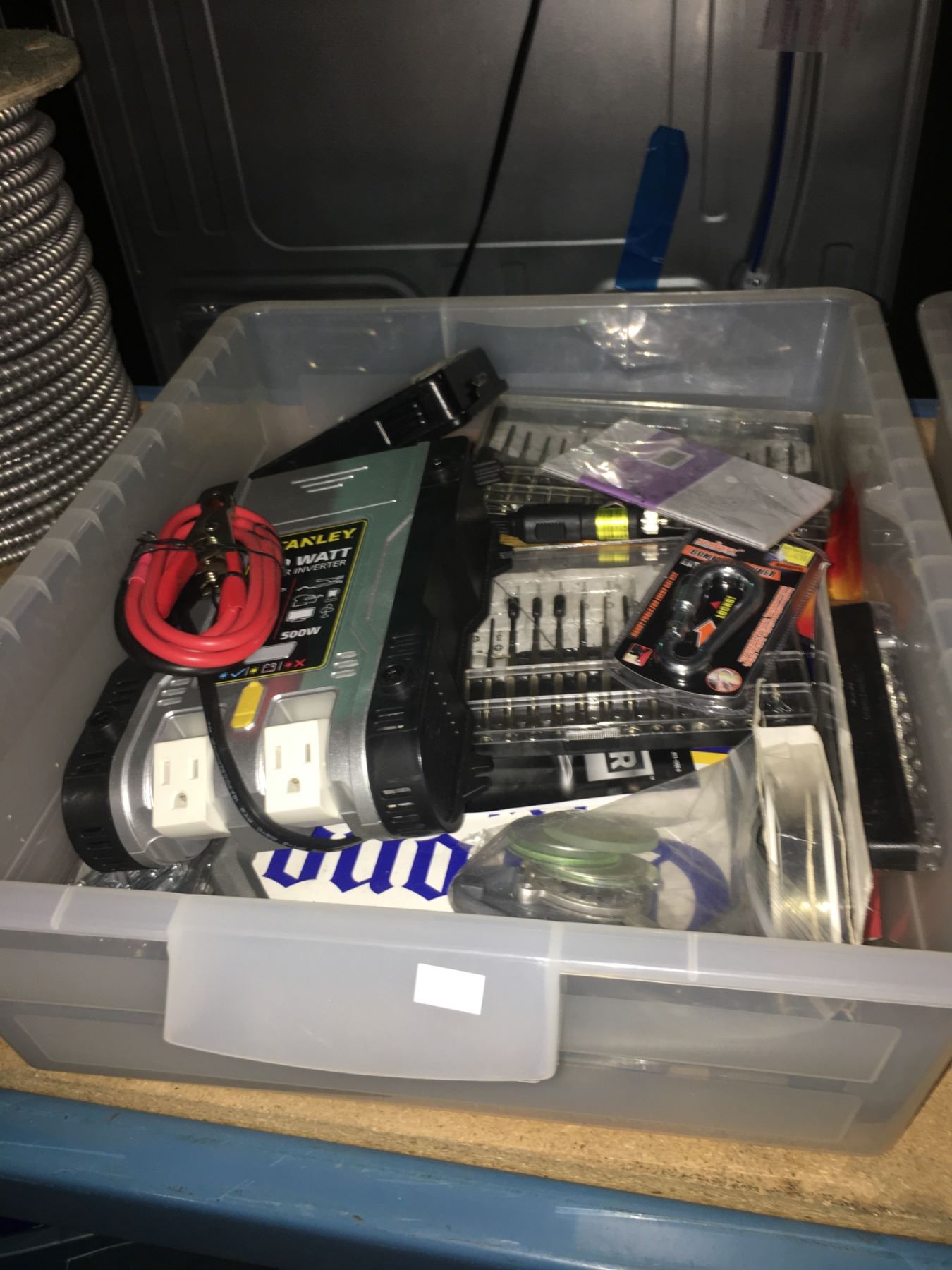 2 BINS OF ASSORTED INVERTER, TOOLS & PRECISION SCREWDRIVERS