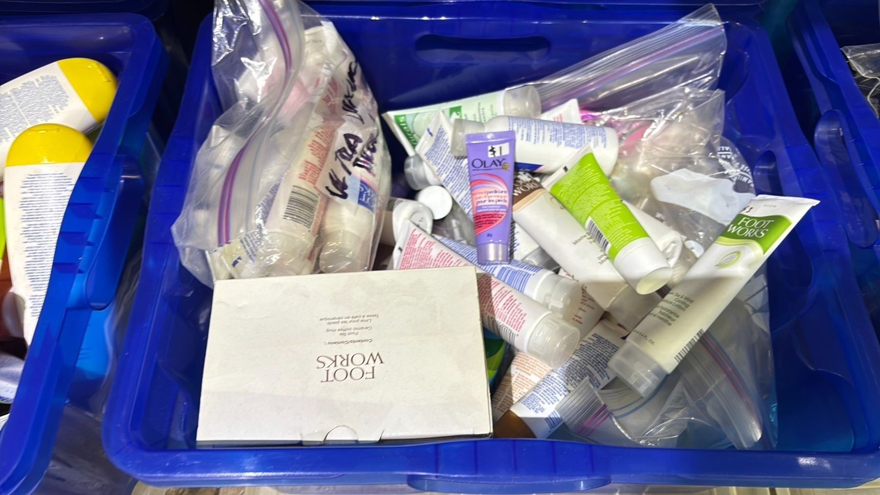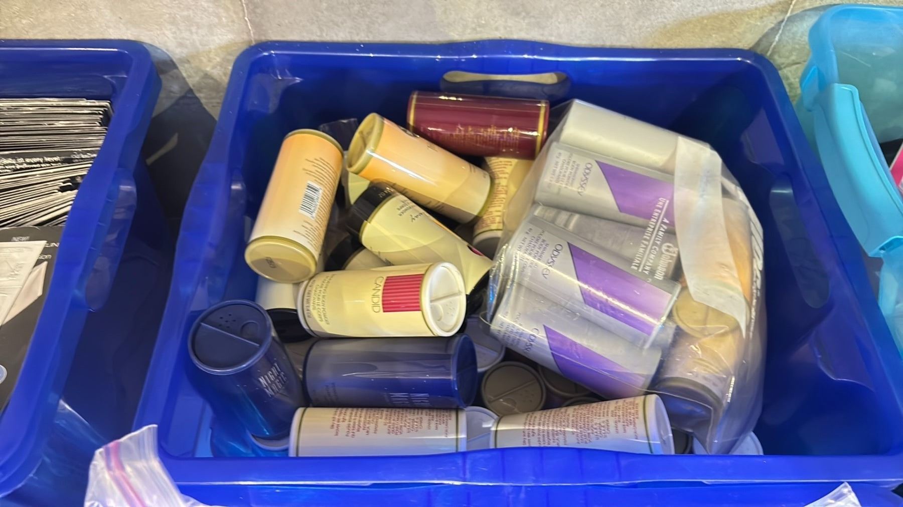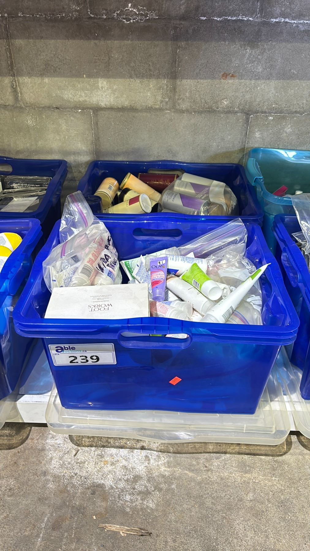 2 BINS OF FOOT WORKS PRODUCTS, HAND CREAM, SHIMMERING BODY POWDER