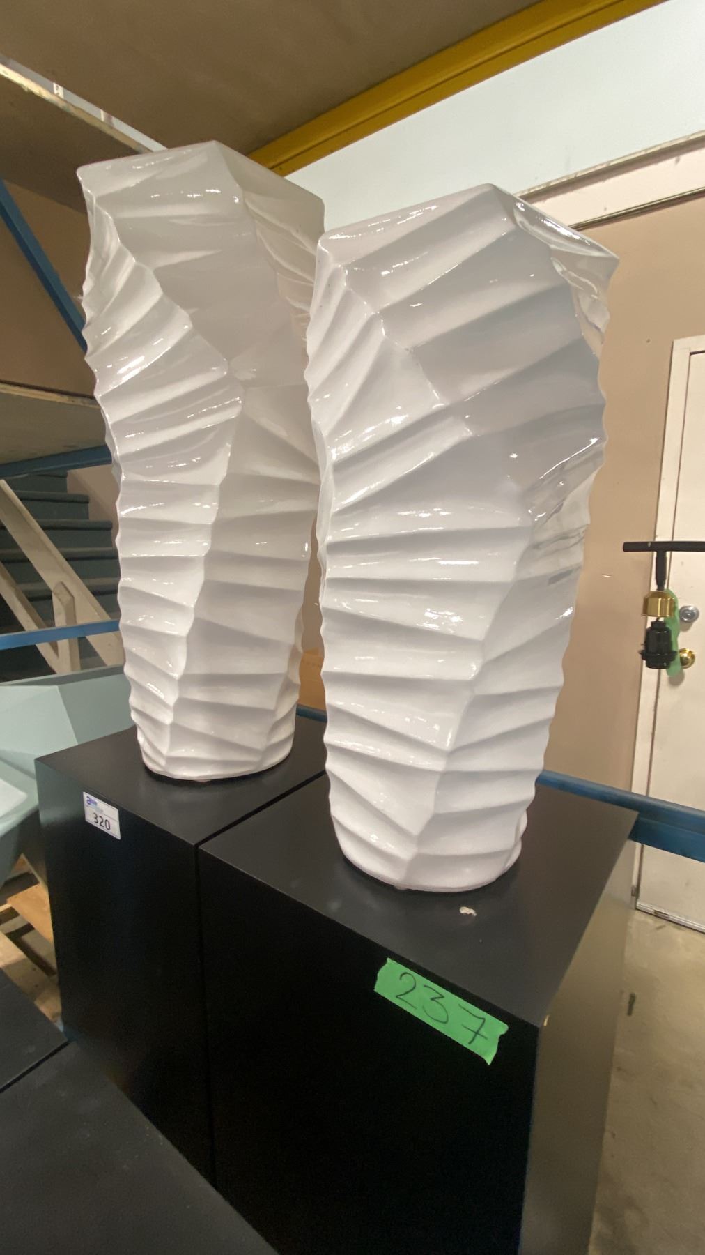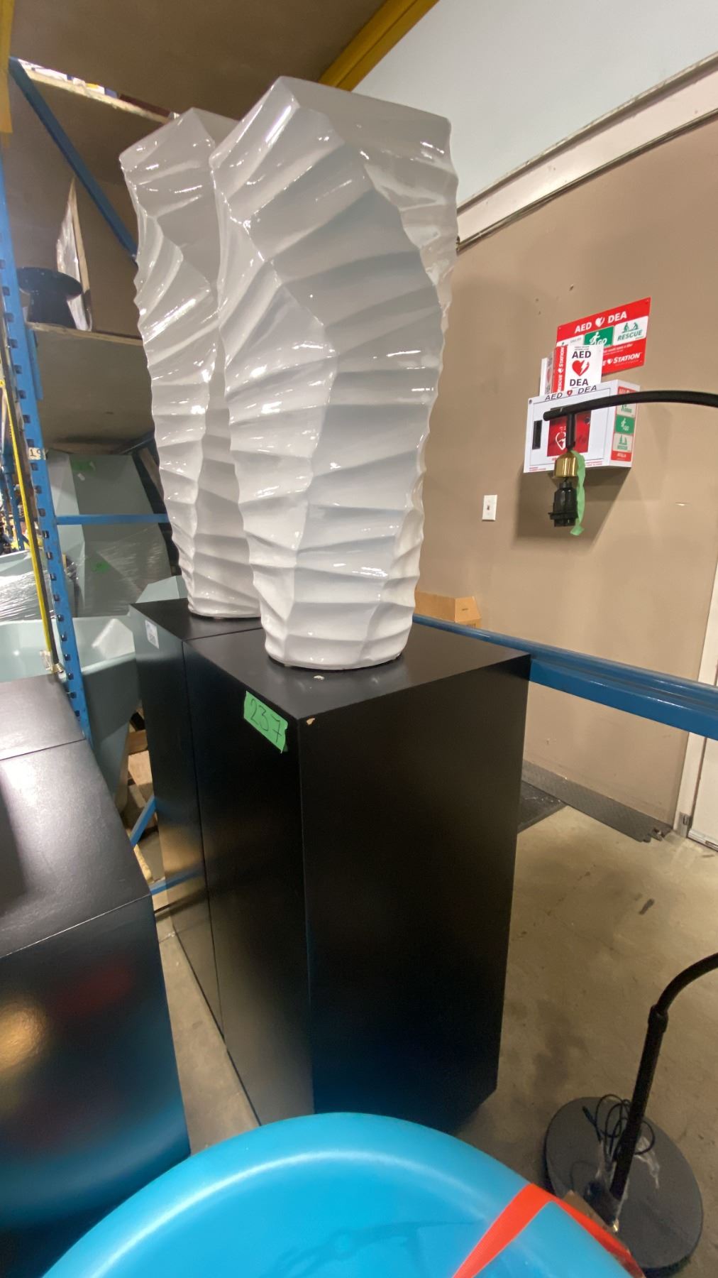 2 BLACK WOODEN PEDESTALS WITH LARGE GLOSS WHITE ART DECO VASE
