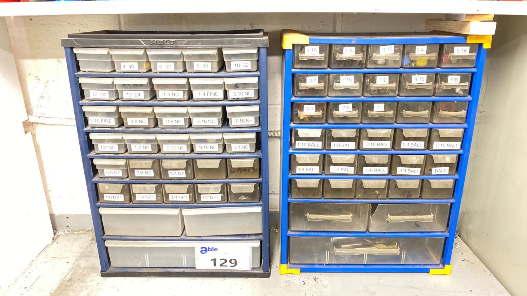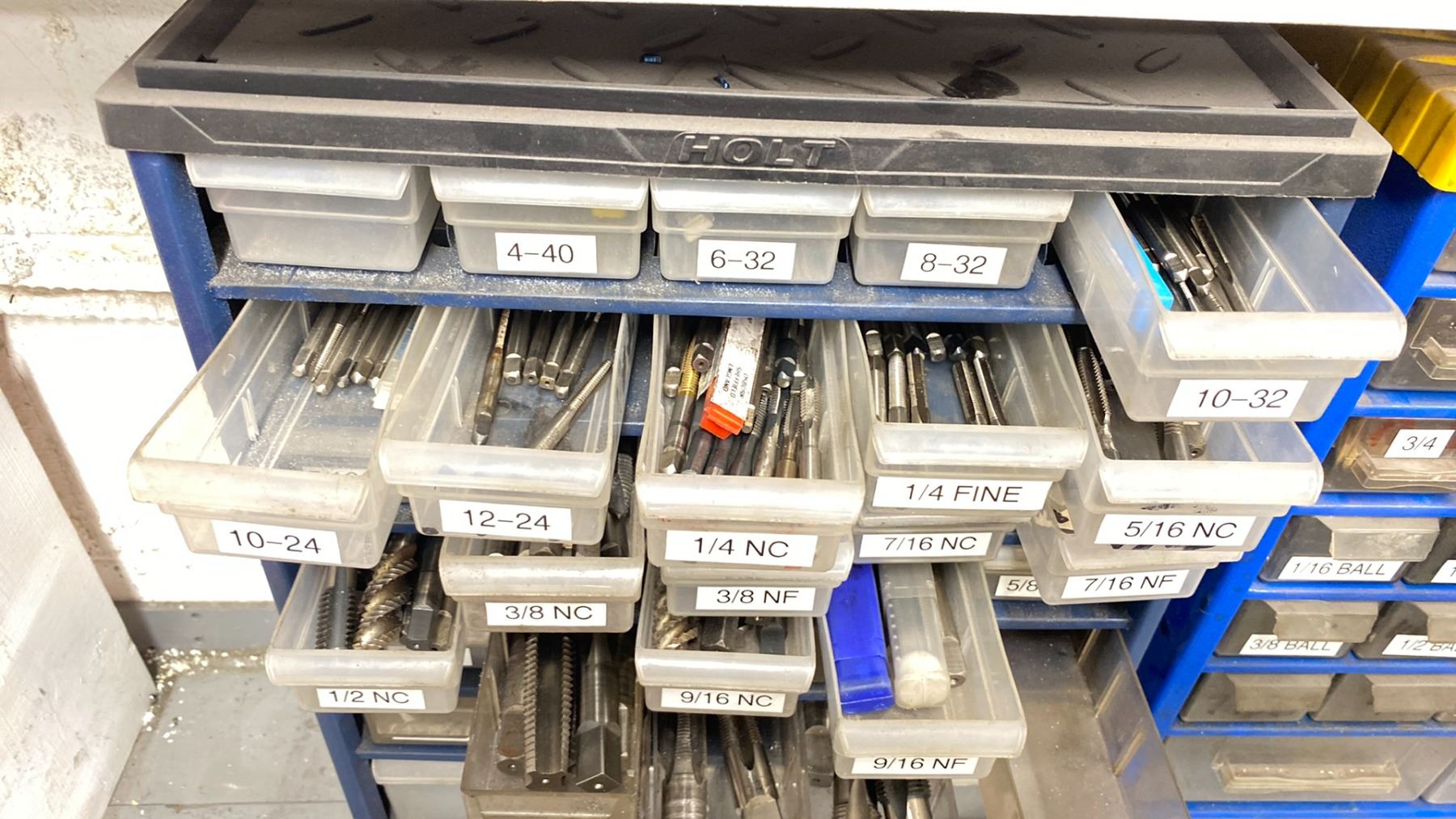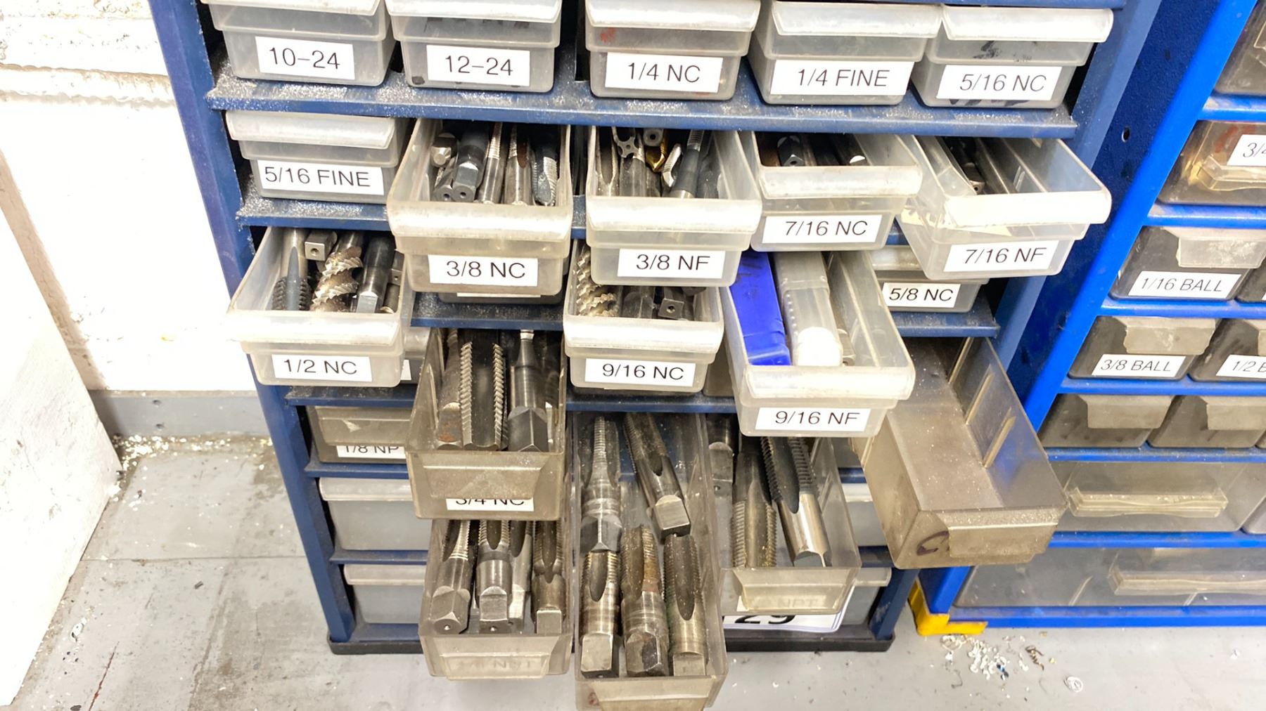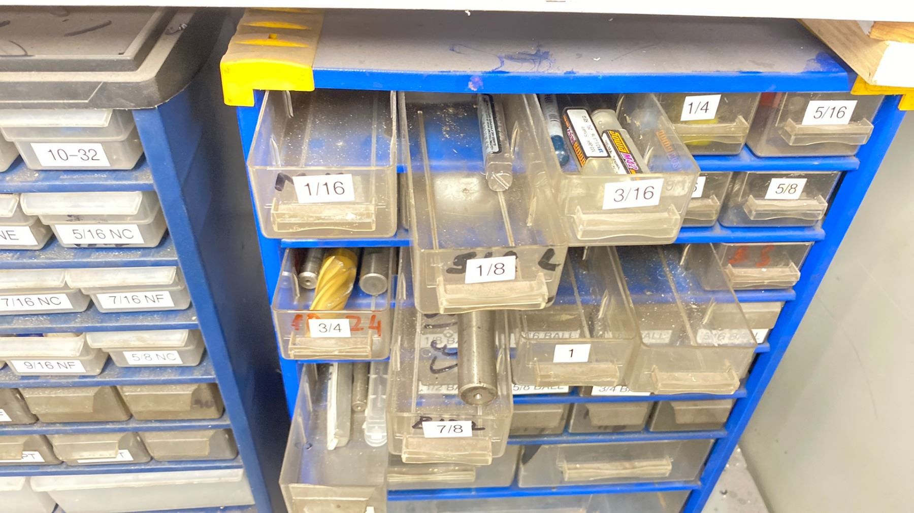 2 BLUE METAL PARTS ORGANIZERS WITH ASSORTED MACHINE TOOLING - TAPS & END MILLS
