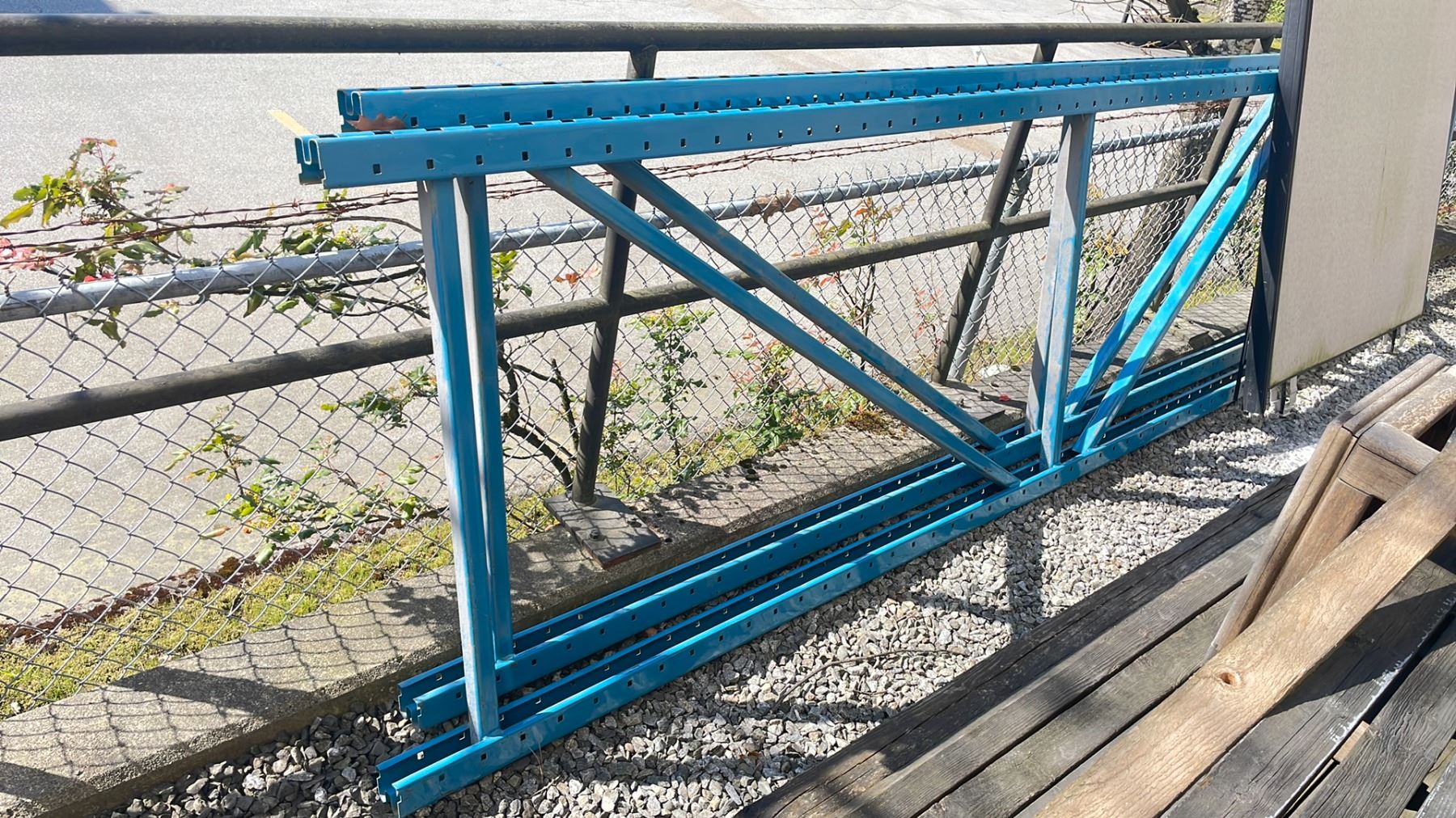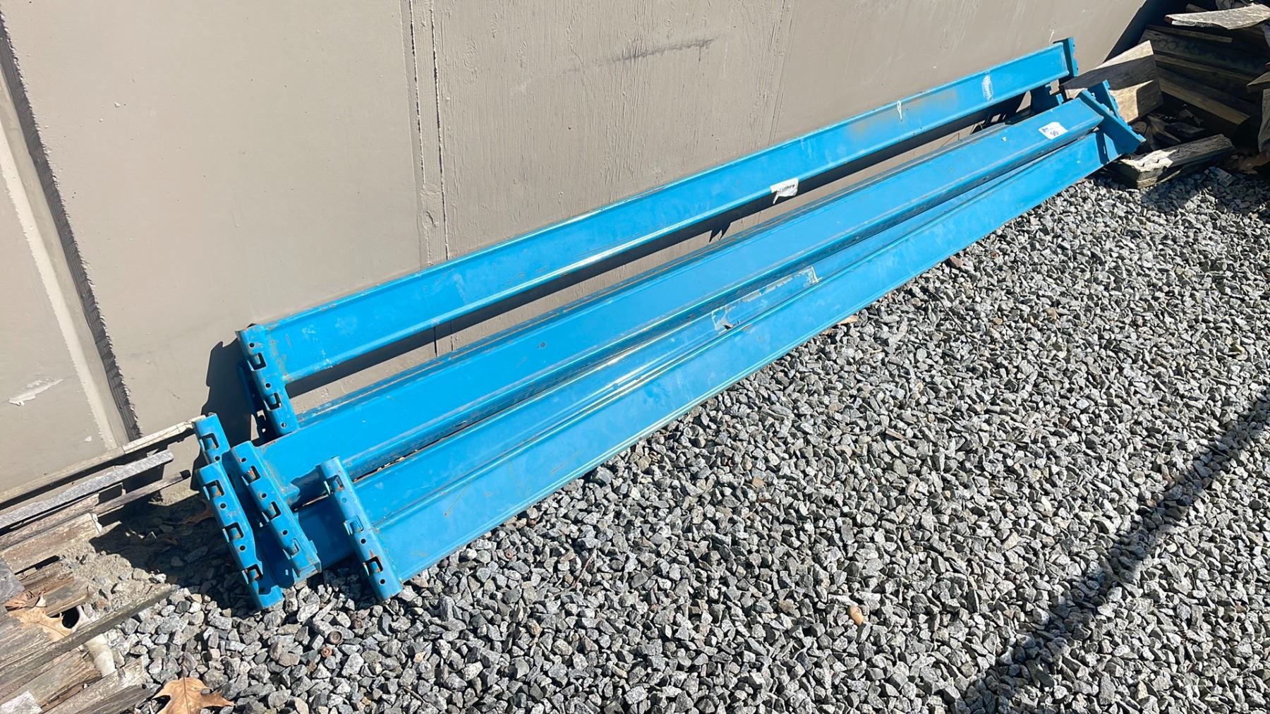 2 BLUE UPRIGHT PALLET RACK STANDS 112" H AND 6 8 FT BLUE CROSS BARS OUTSIDE BACK SHOP