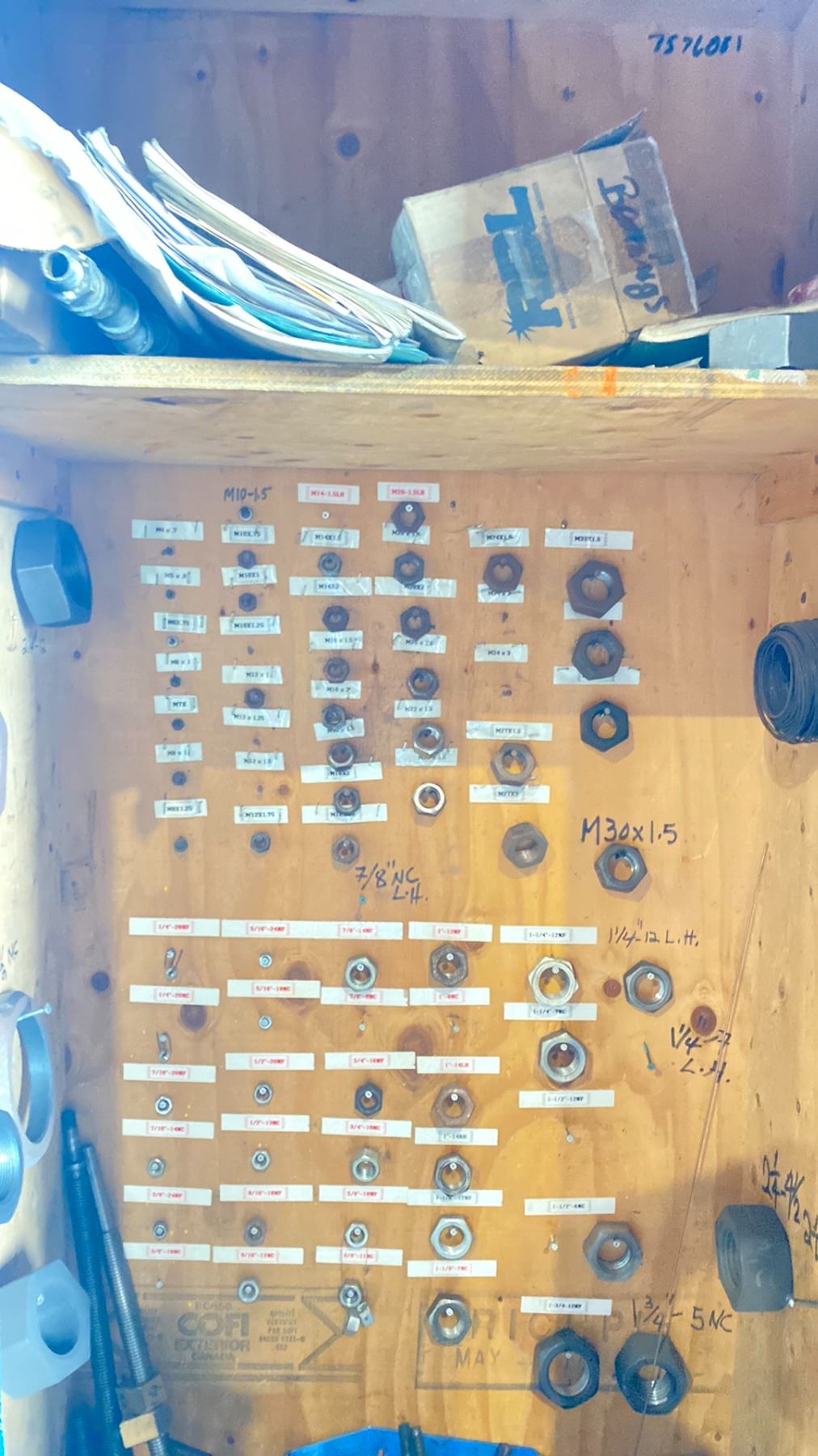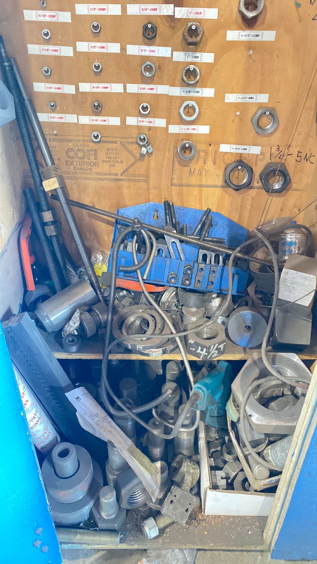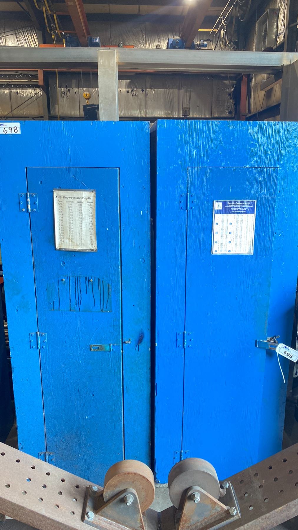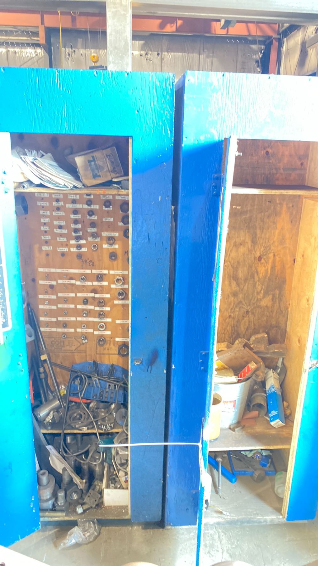 2 BLUE WOODEN STORAGE CABINETS & CONTENTS - ASSORTED NUTS, BOLTS, MACHINE PARTS - APPROX. 2.5'W X 2'D X 6'H