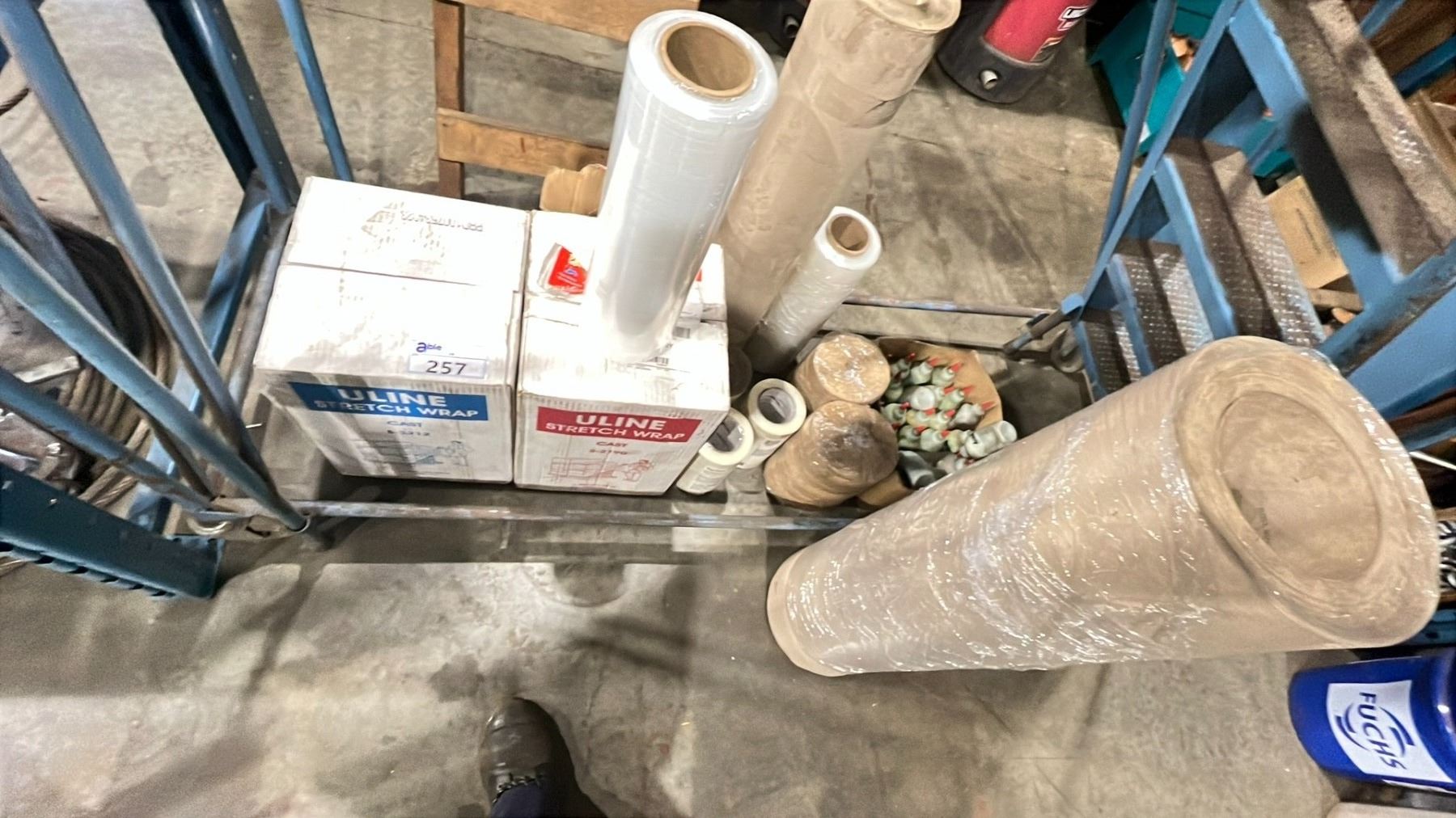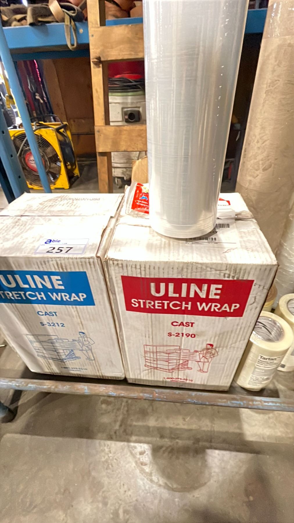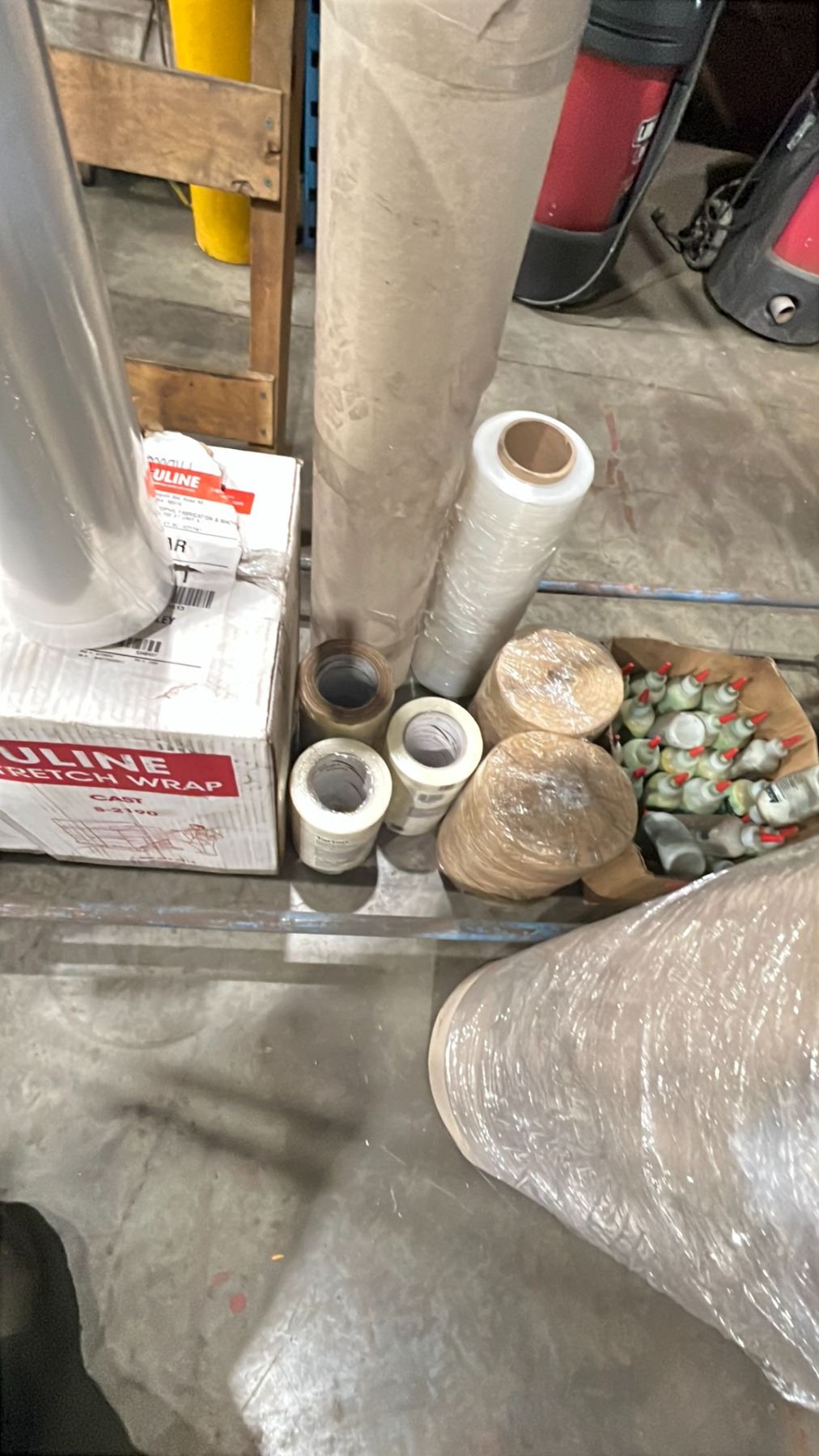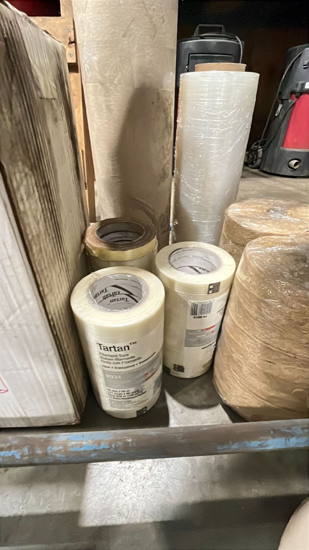 2 BOXES OF 4 ULINE STRETCH WRAP, 2 BUNDLES OF TWINE, ROLLS OF FILAMENT TAPE, ALL PURPOSE WORKING COMPOUND & HEAVY DUTY WRAPPING PAPER
