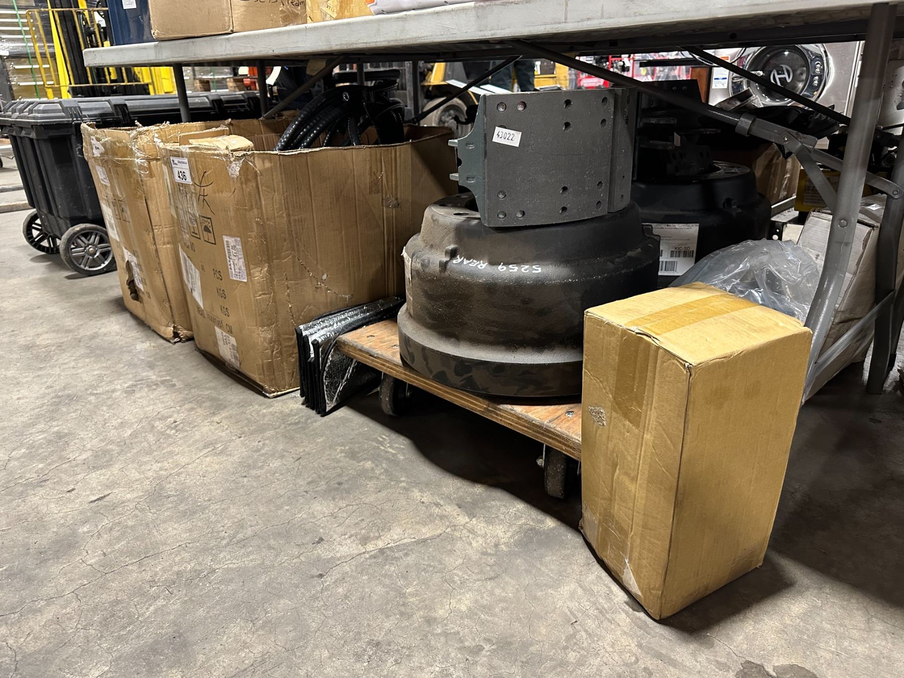 2 BOXES OF ASSORTED ELECTRICAL CABLE, ASSORTED HAND TOOLS, CHAIN, PAIR OF 10 HOLE DRUM BRAKE, PAIR OF 10 HOLE DISC BRAKES, AND ASSORTED HARDWARE