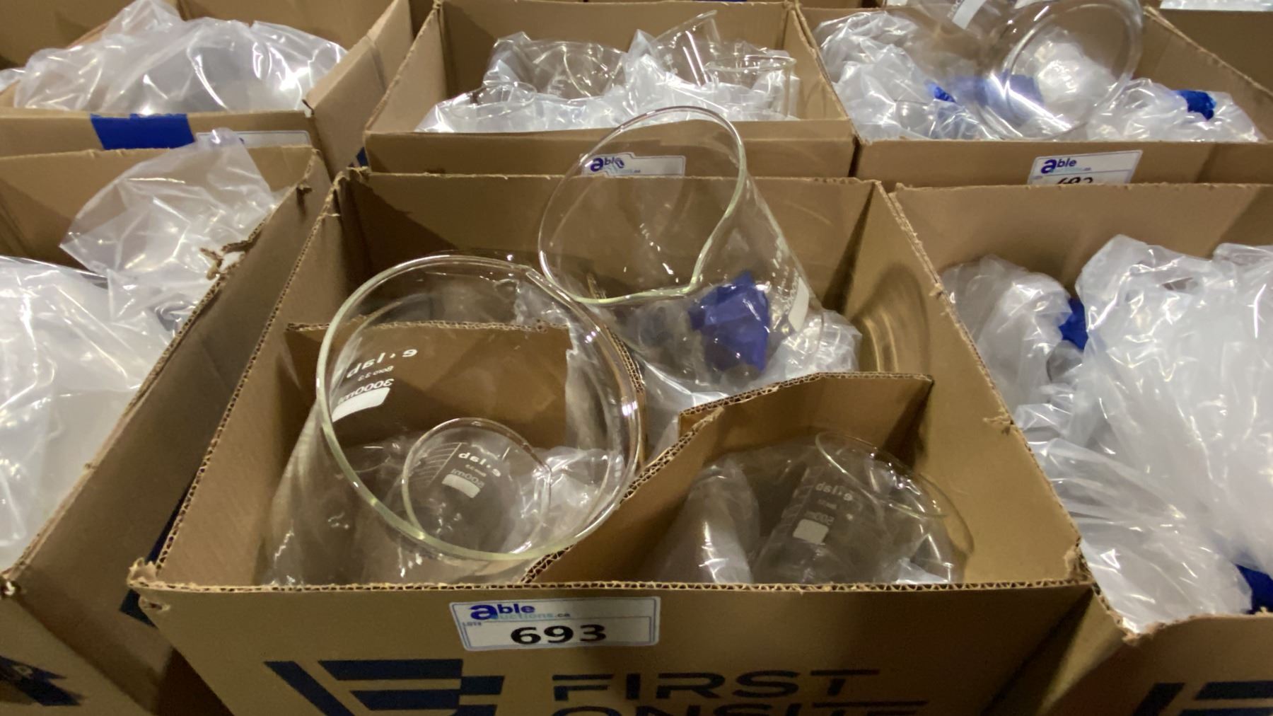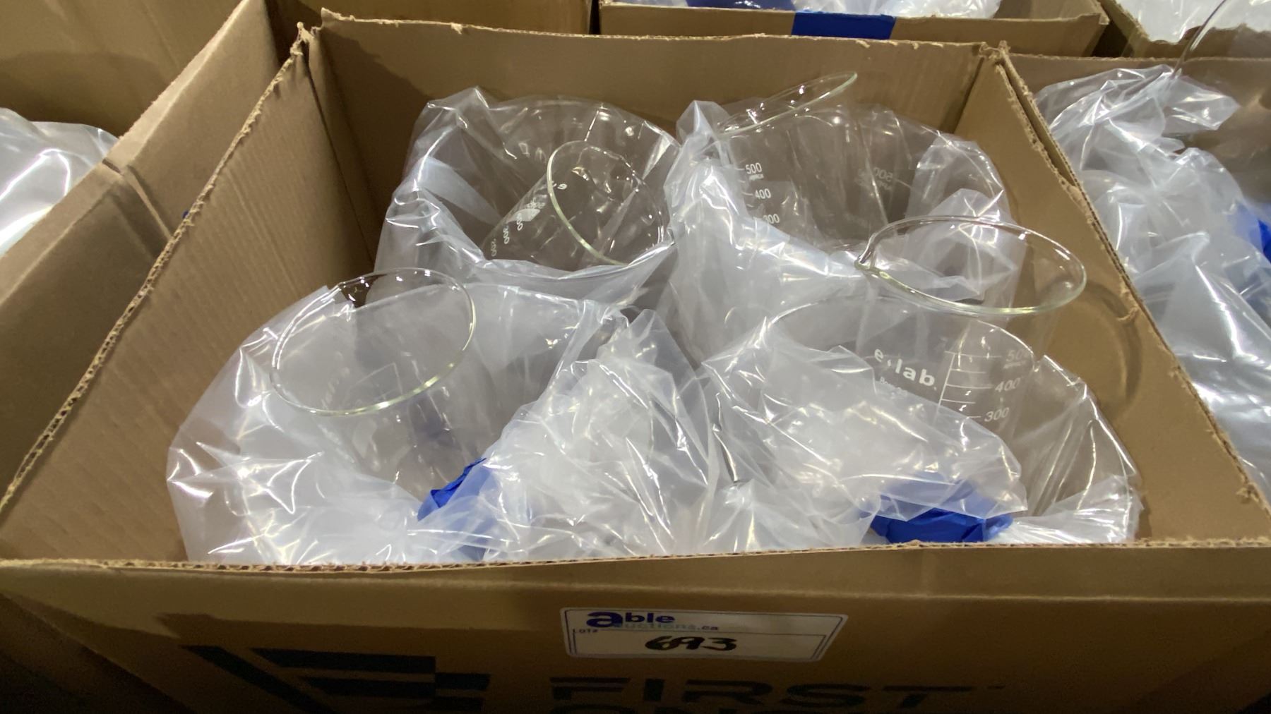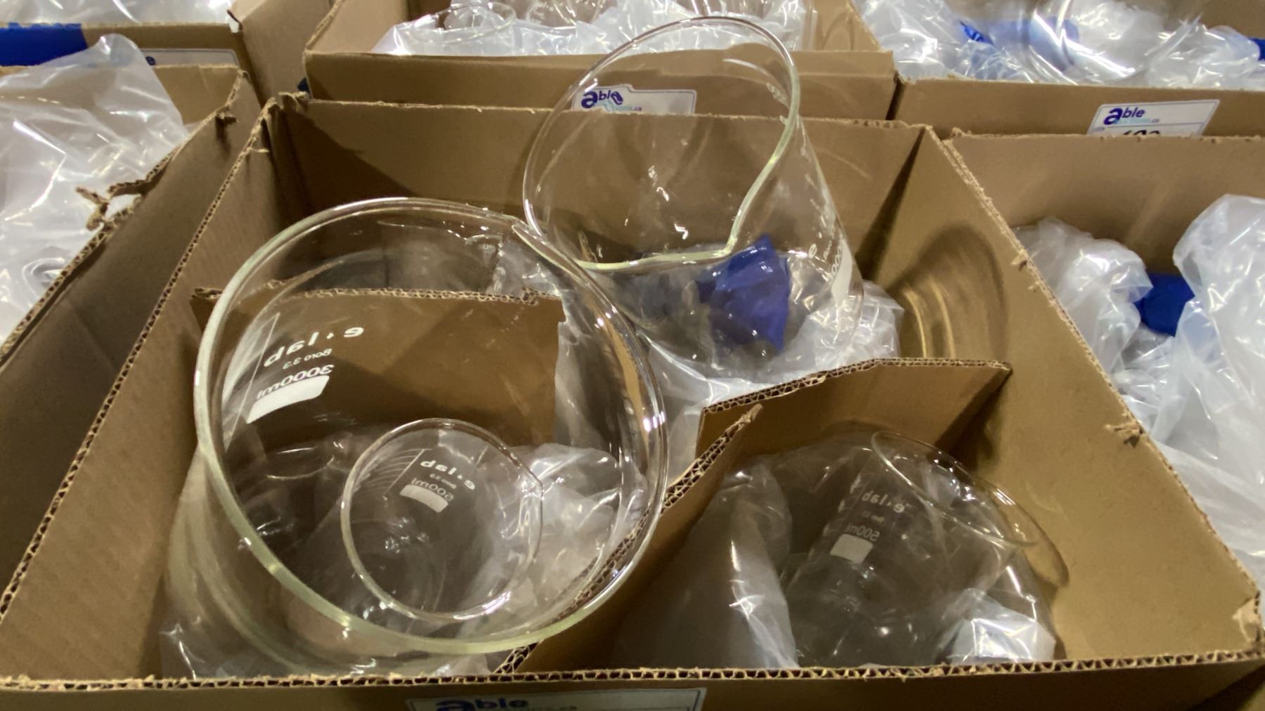 2 BOXES OF ASSORTED LABORATORY GRADE GLASS BEAKERS