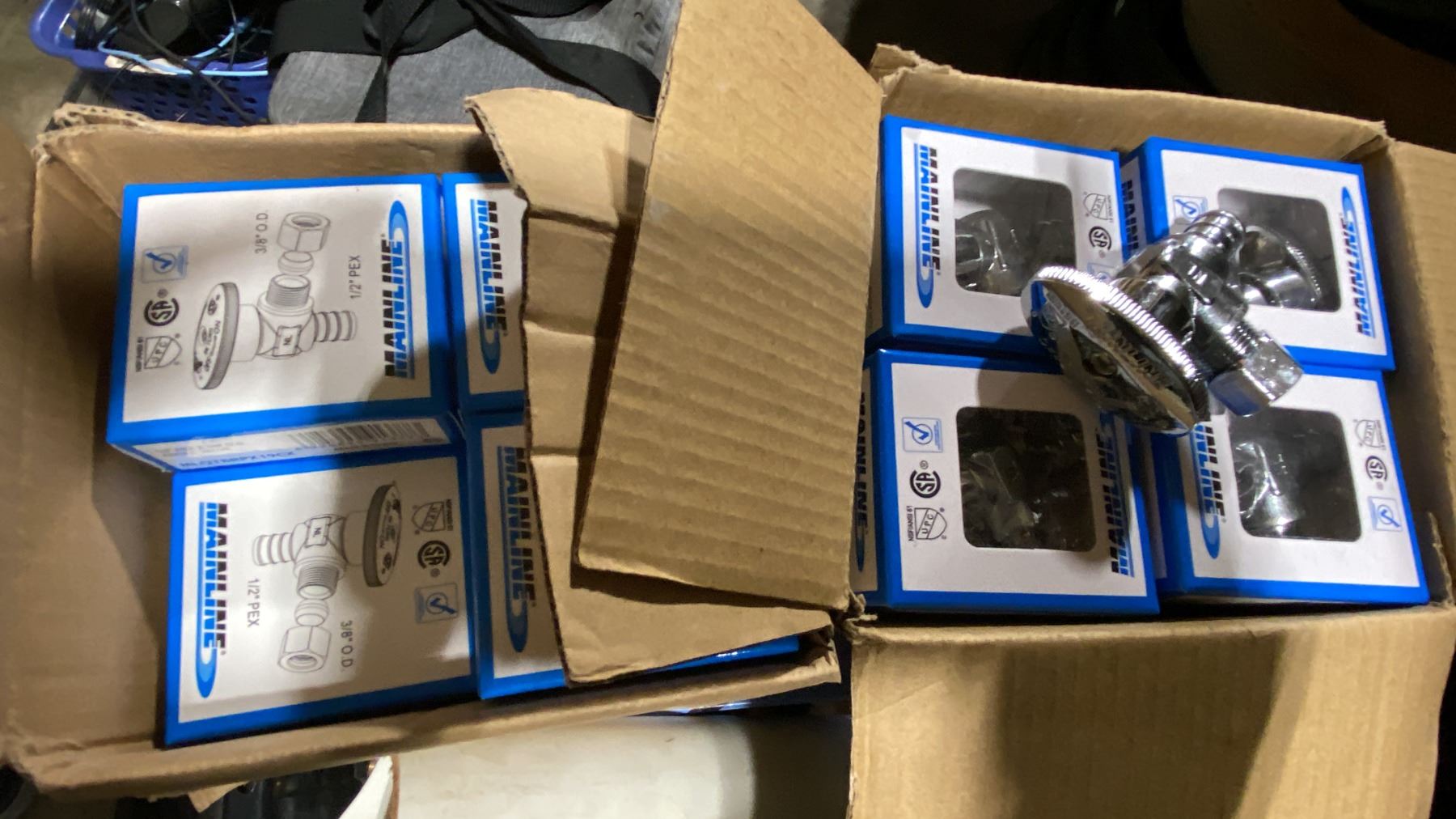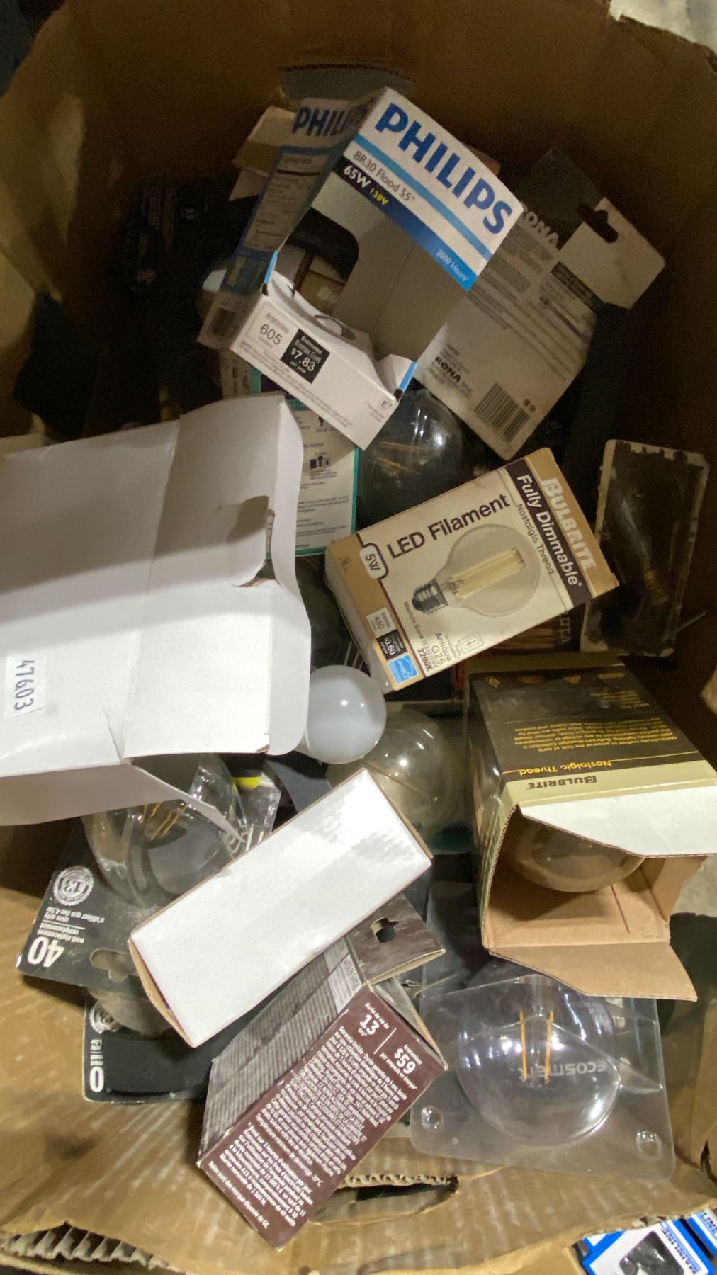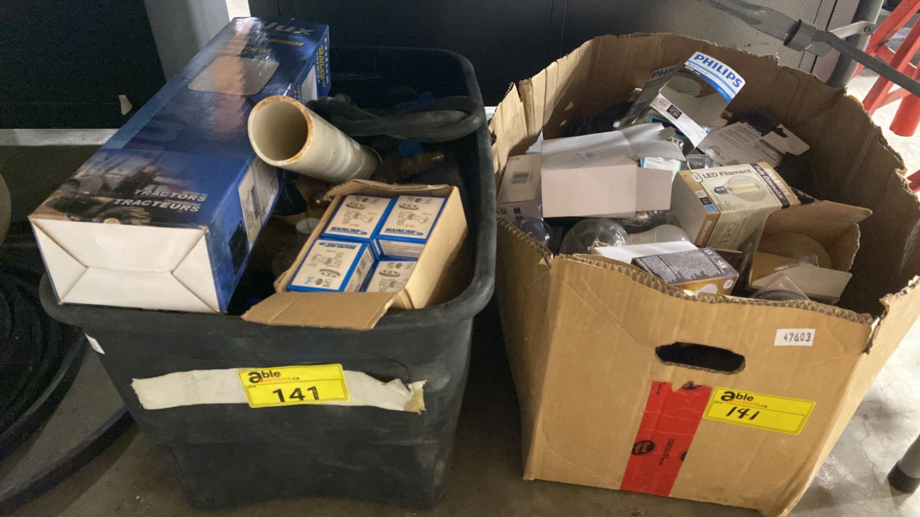 2 BOXES OF ASSORTED LIGHT BULBS, MAINLINE STOP VALVES, AUTOMOTIVE MIRROR & ASSORTED PLUMBING PARTS