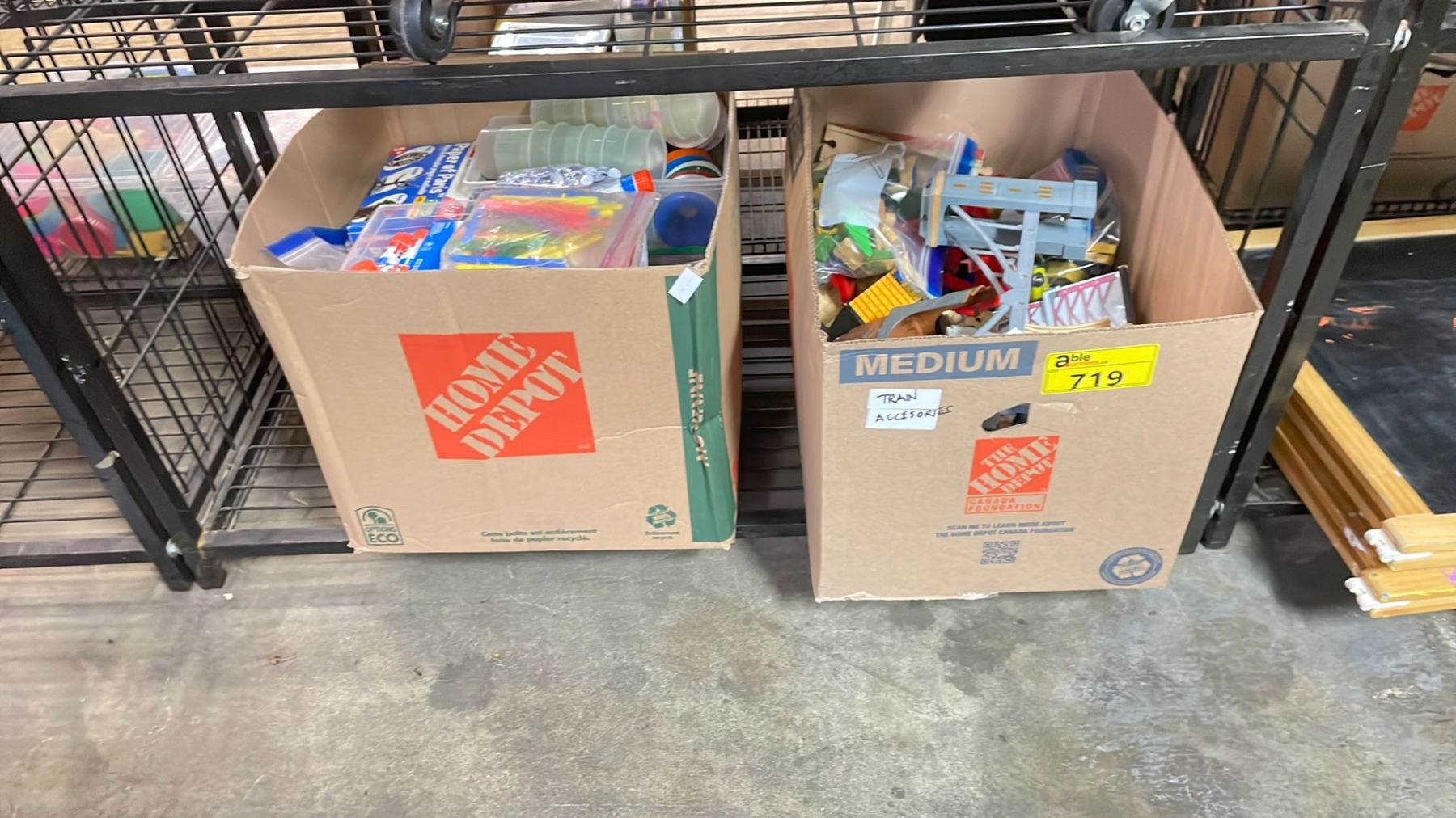 2 BOXES OF ASSORTED PLASTIC CUPS, CRAFT SUPPLIES & TOYS