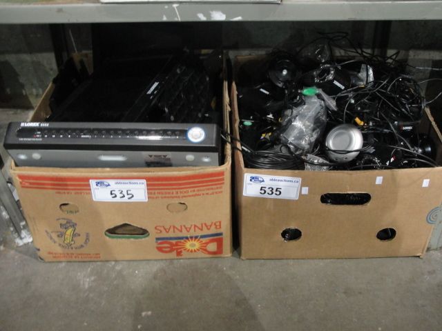 2 BOXES OF ASSORTED SURVEILLANCE EQUIPMENT; RECORDERS, MONITORS, CAMERAS ETC