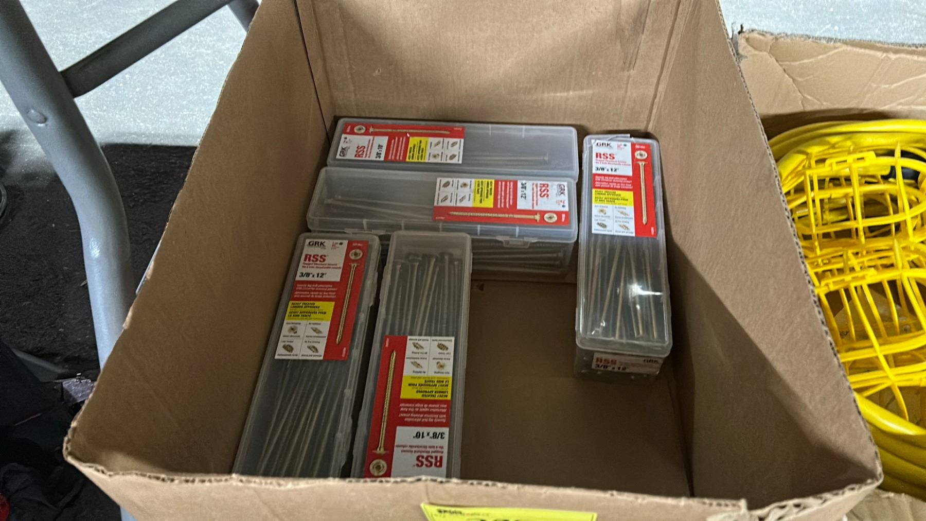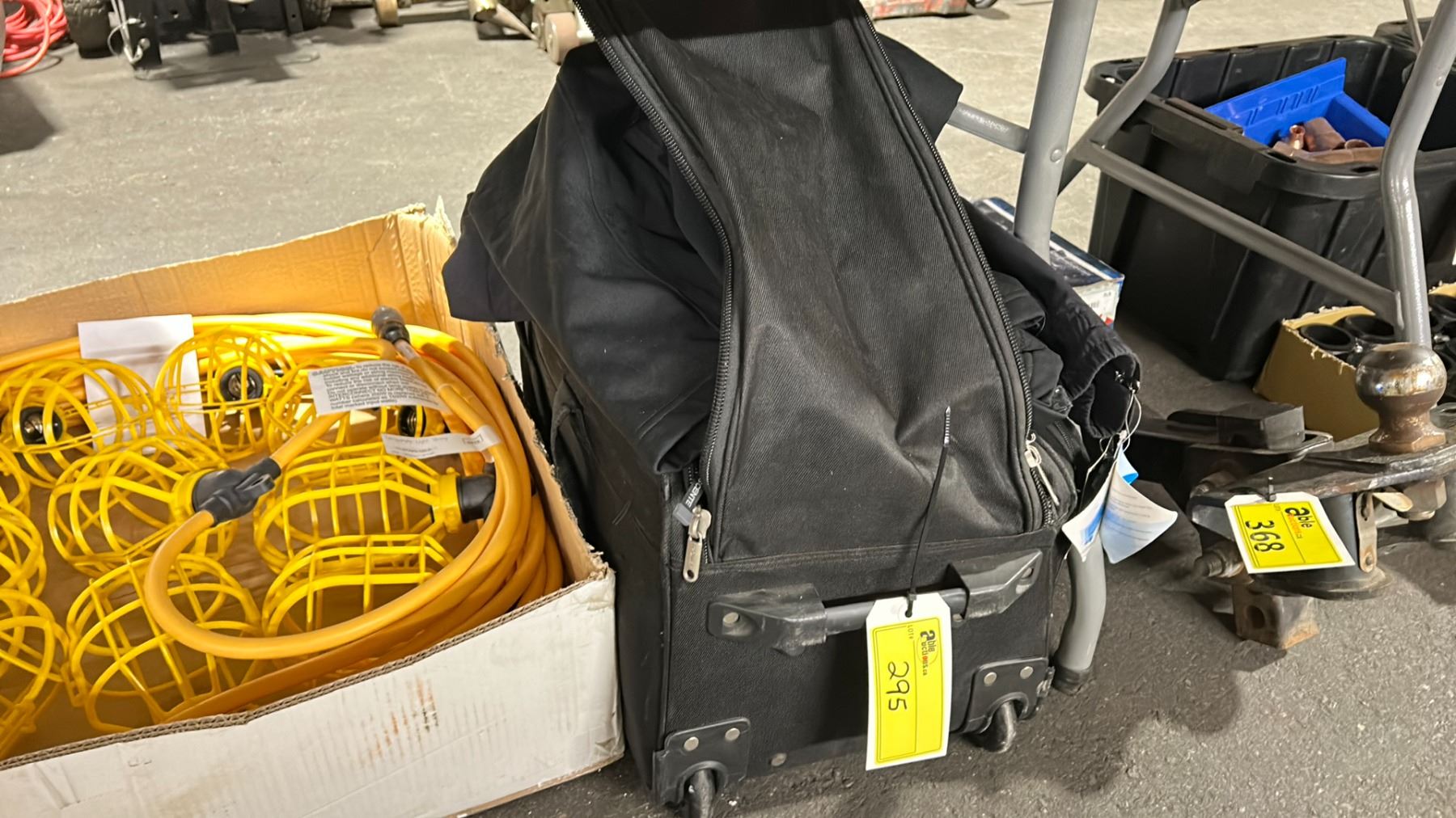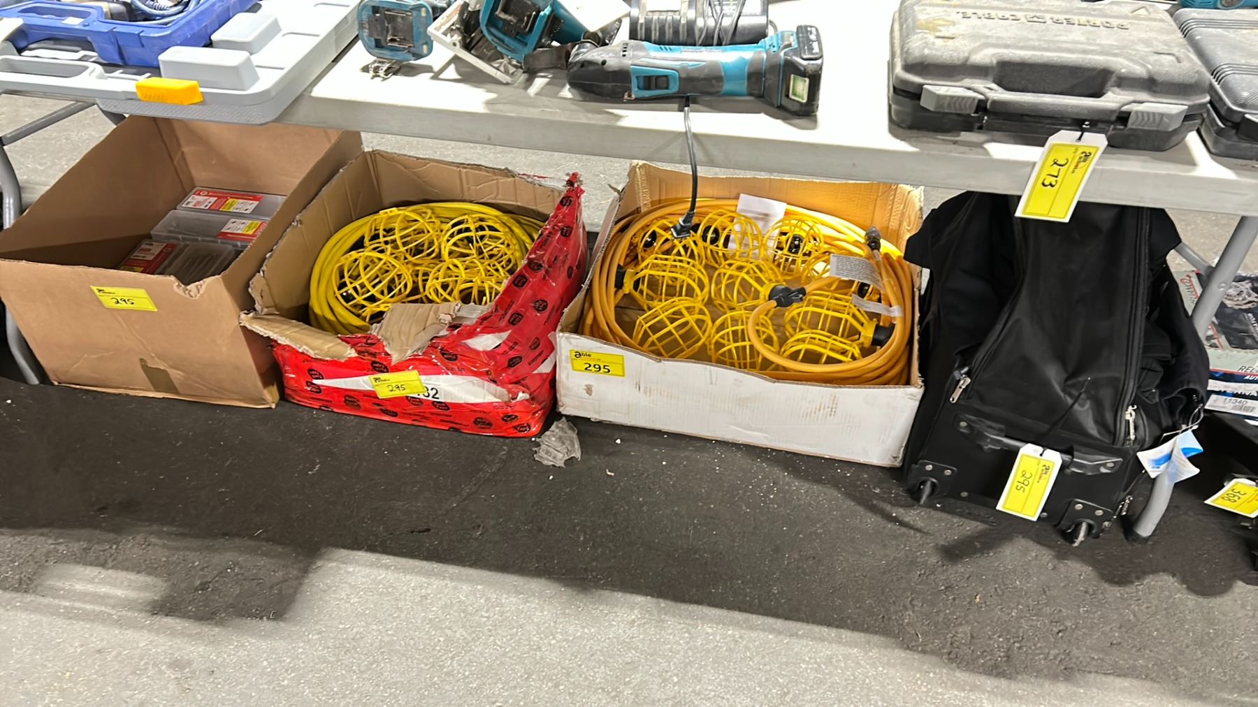 2 BOXES OF INDUSTRIAL ELECTRIC JOB SITE STRING LIGHTS, BOX OF DECK SCREWS, & BAG OF ASSORTED CARRY BAGS