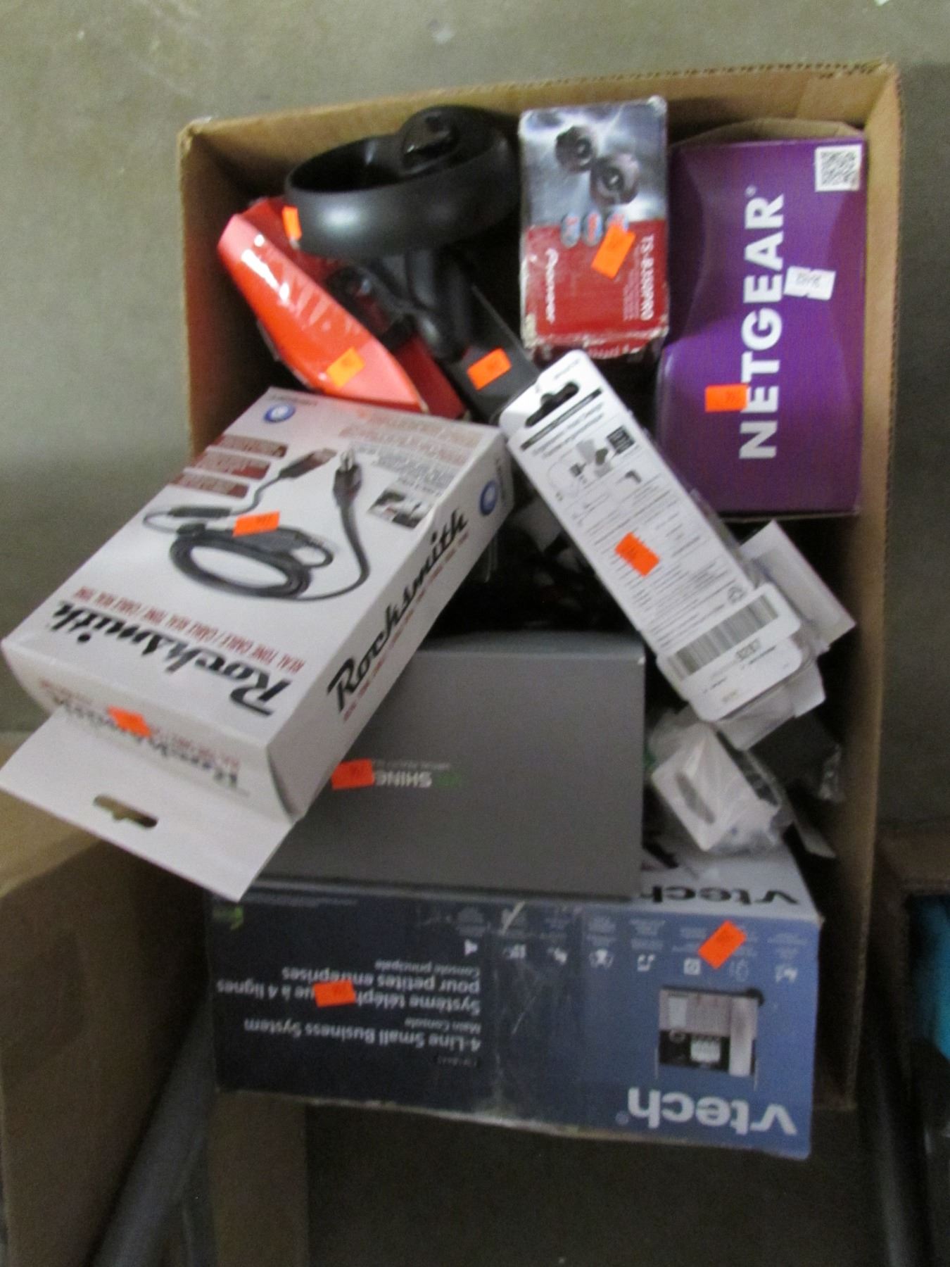 2 BOXES OF NETGEAR WIFI EXTENDERS, VTECH SMALL BUSINESS SYSTEM PHONE, ROCKSMITH CABLE, DVDS, TABLET ACCESSORIES, HEADPHONES, ASSORTED ELECTRONICS & MISC