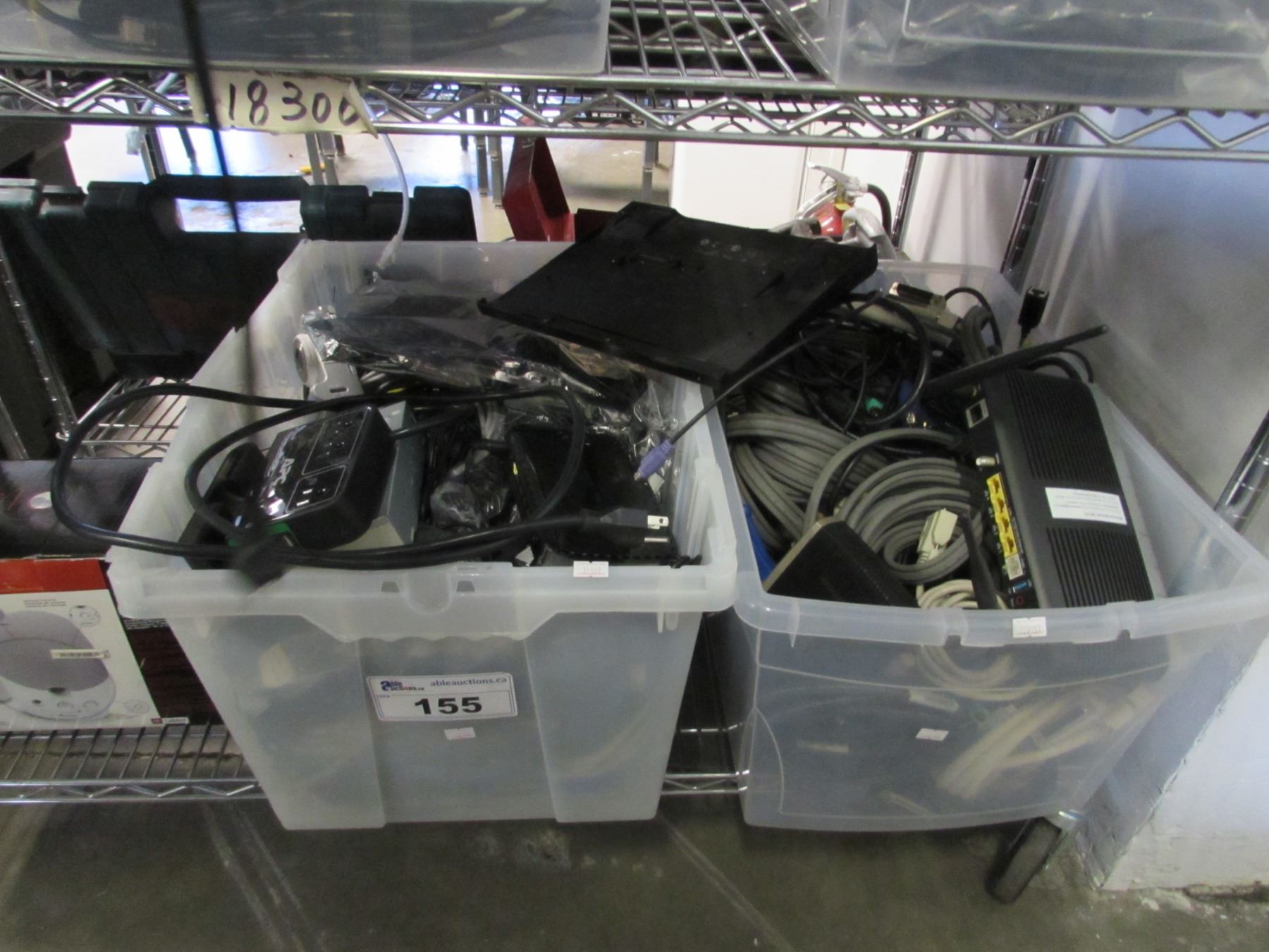 2 BOXES OF POWER CORDS, ETHERNET CORDS, POWER BLOCKS, ROUTER, SPEAKERS, ASSORTED CORDS & MISC