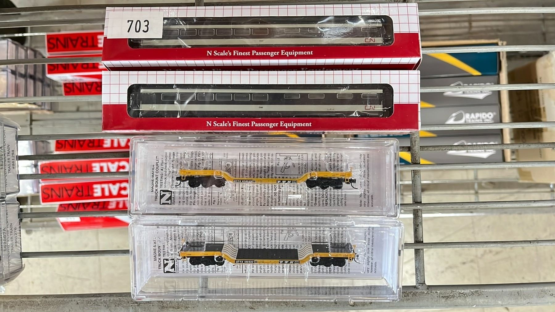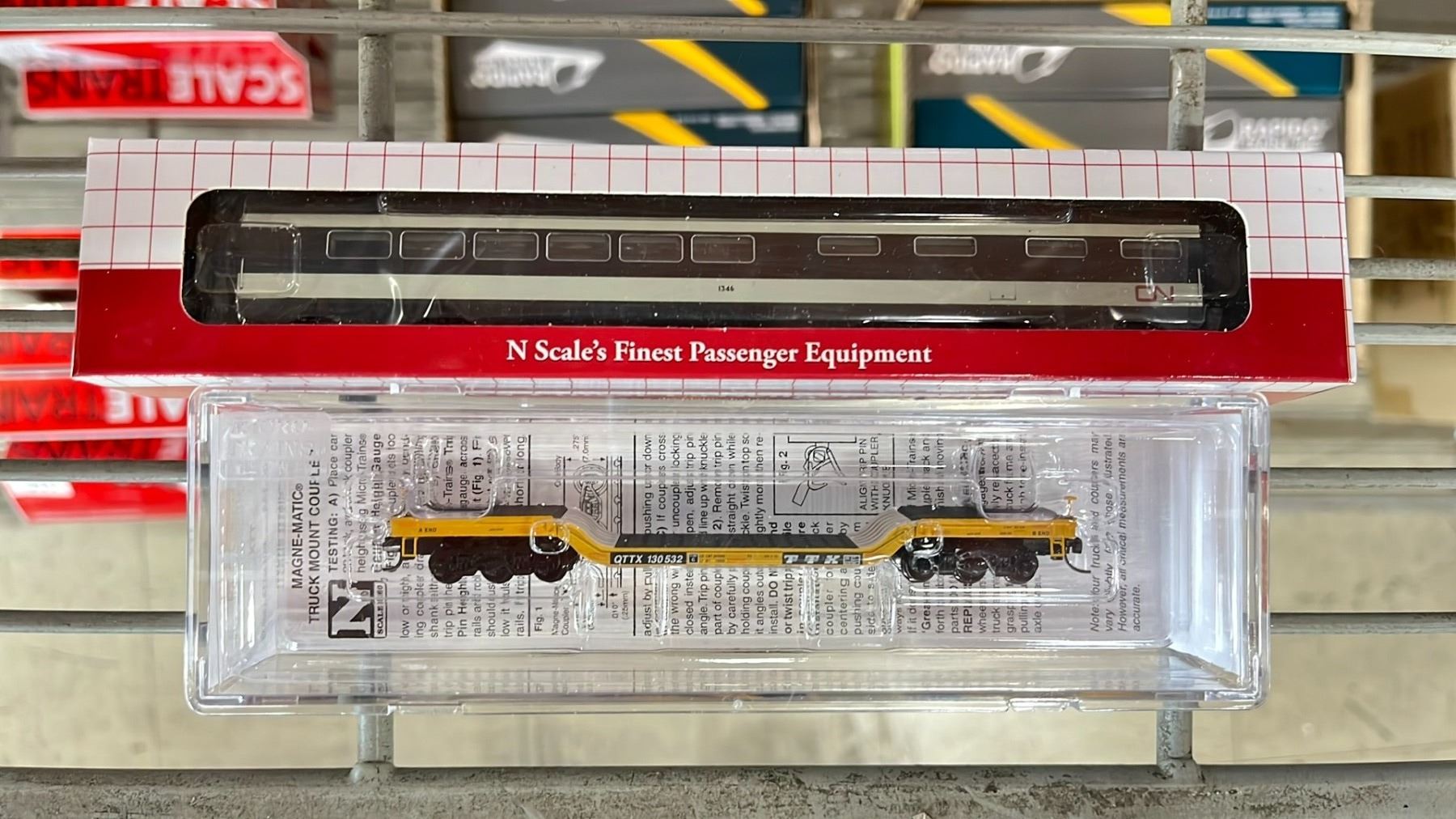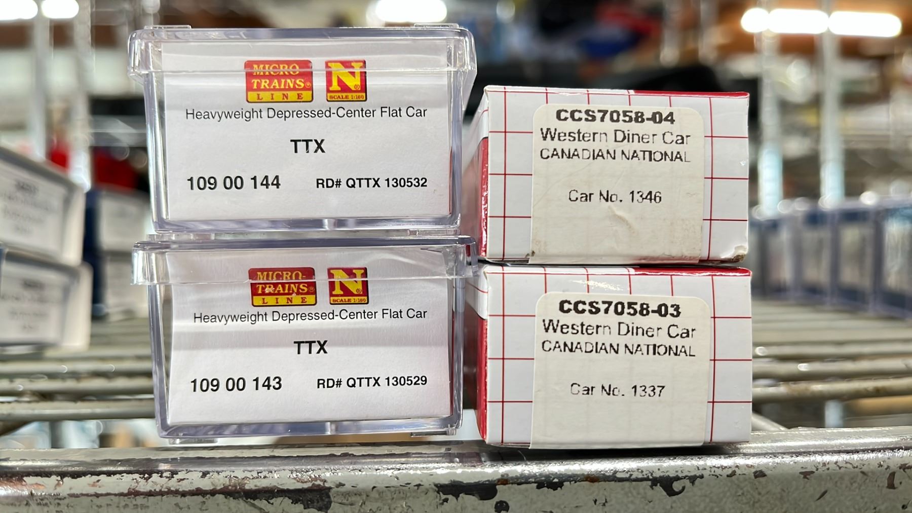 2 CANADIAN NATIONAL WESTERN DINER N SCALE MODEL TRAINS & 2 HEAVYWEIGHT DEPRESSED CENTER FLAT CARS
