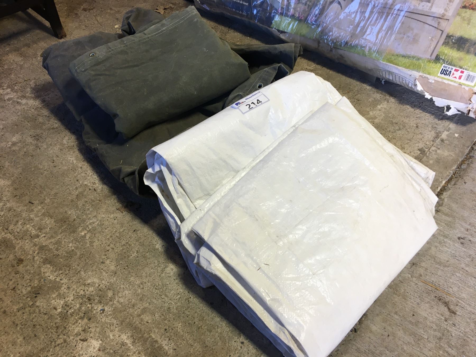 2 CANVAS APPROX.8FT X 12FT TARPS AND 2 WHITE TARPS APPROX. 10FT X 12FT