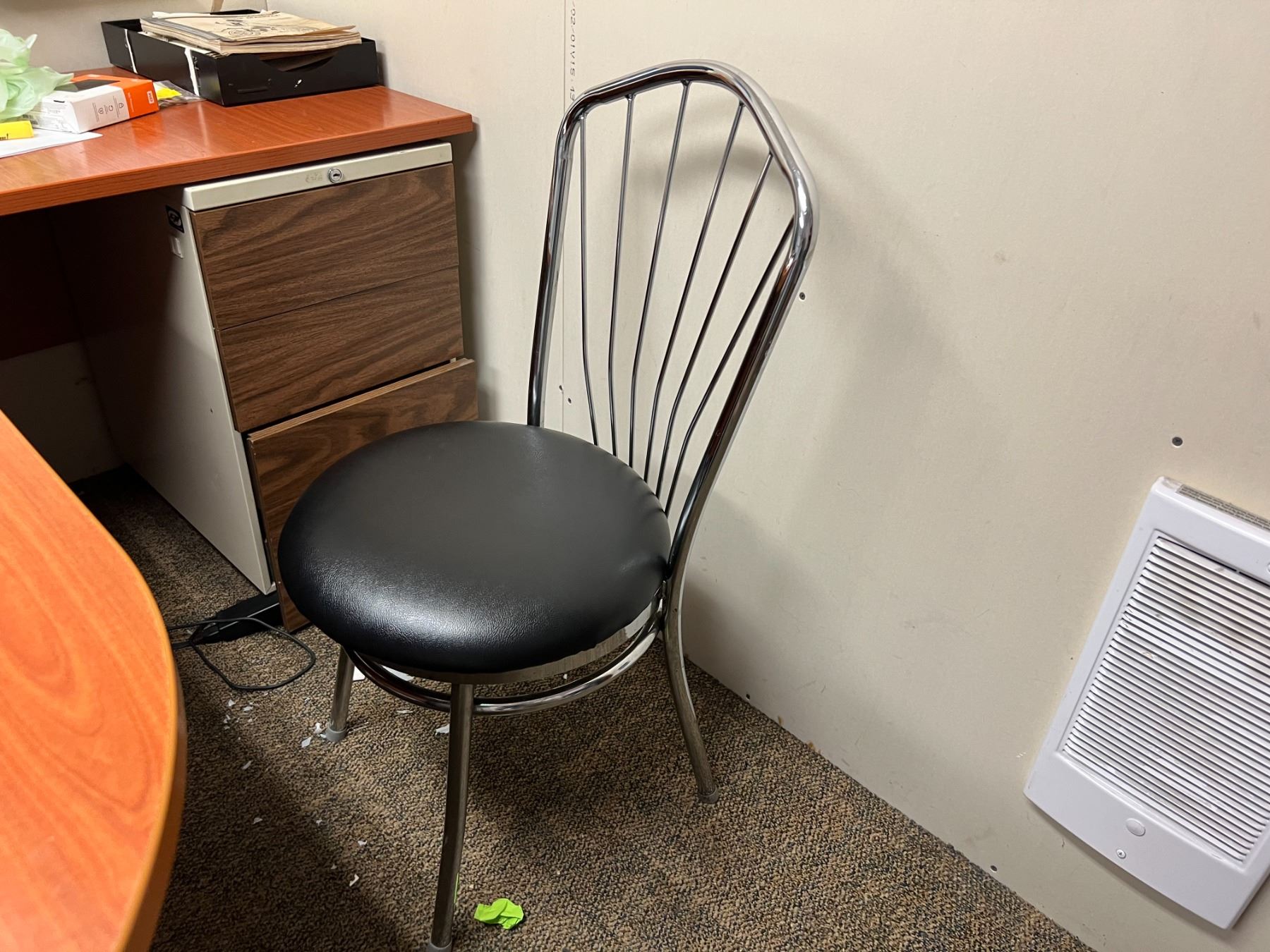 2 CHROME FRAMED CHAIRS (1 SEAT IS LOOSE) & WOOD SLATE SHELF
