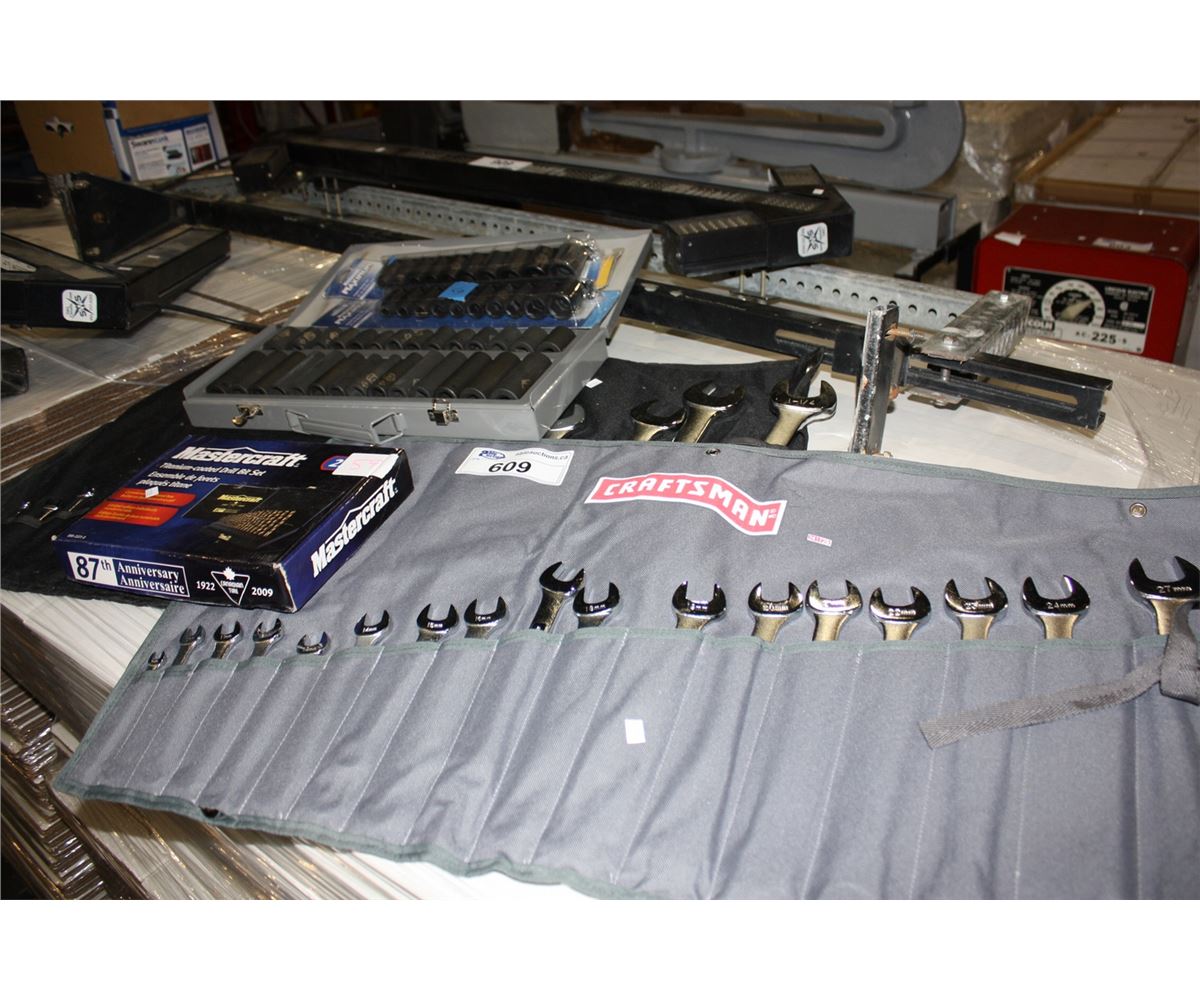 2 CRAFTSMAN COMBINATION WRENCH SETS, 3 SOCKET SETS AND ONE MASTERCRAFT TITANIUM COATED DRILL BIT SET