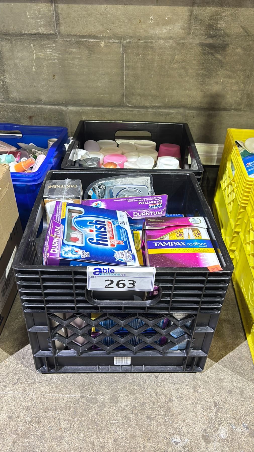 2 CRATES OF SHAMPOO, CONDITIONER, FINISH DISHWASHER TABS, TAMPONS, RAID & MORE