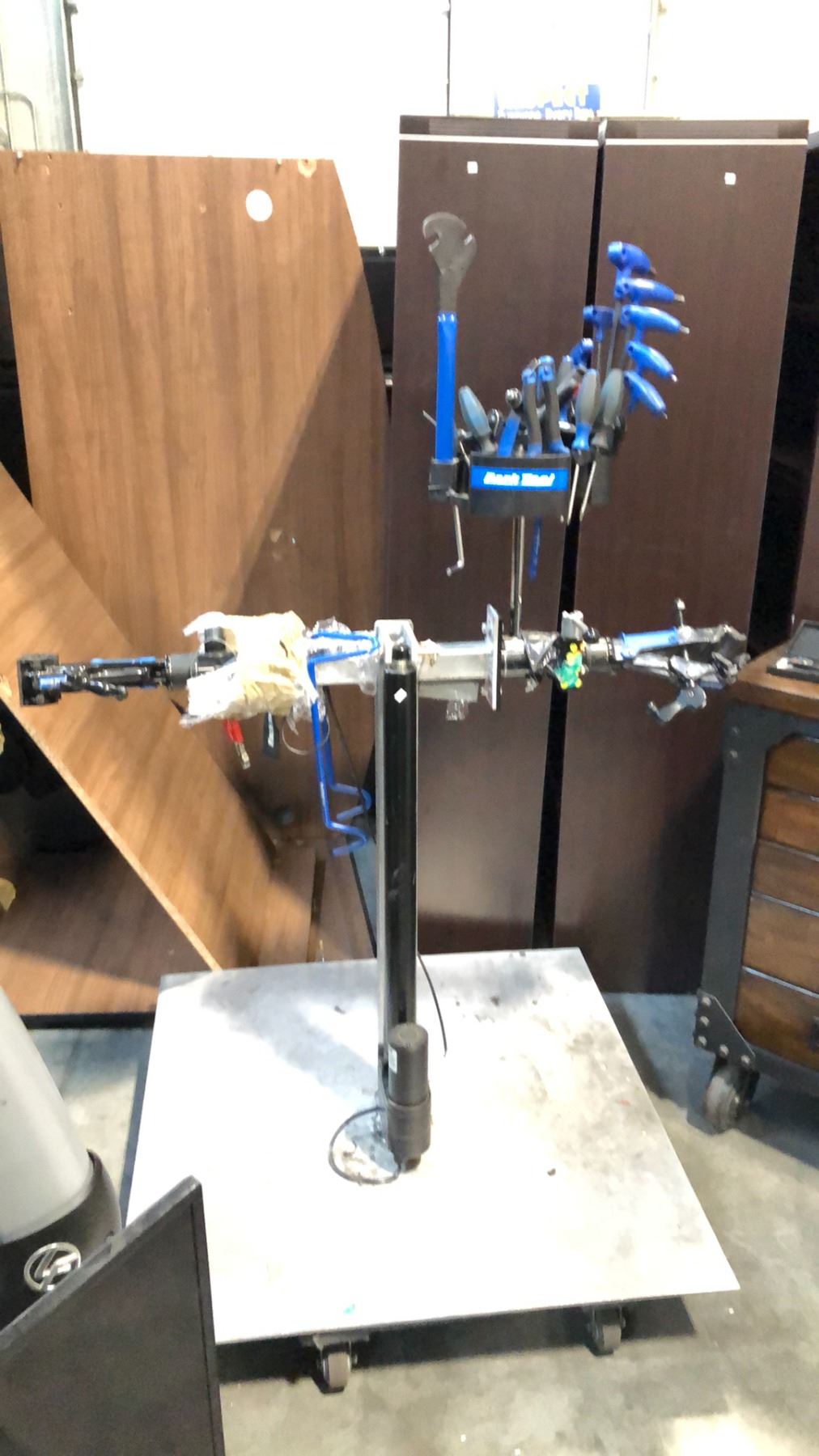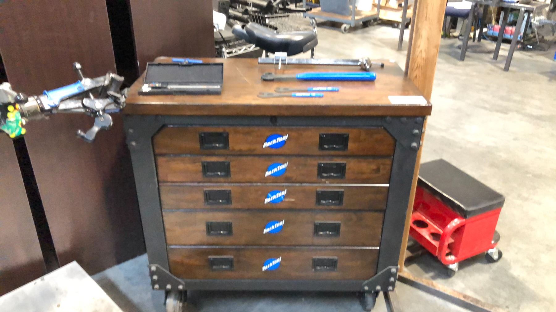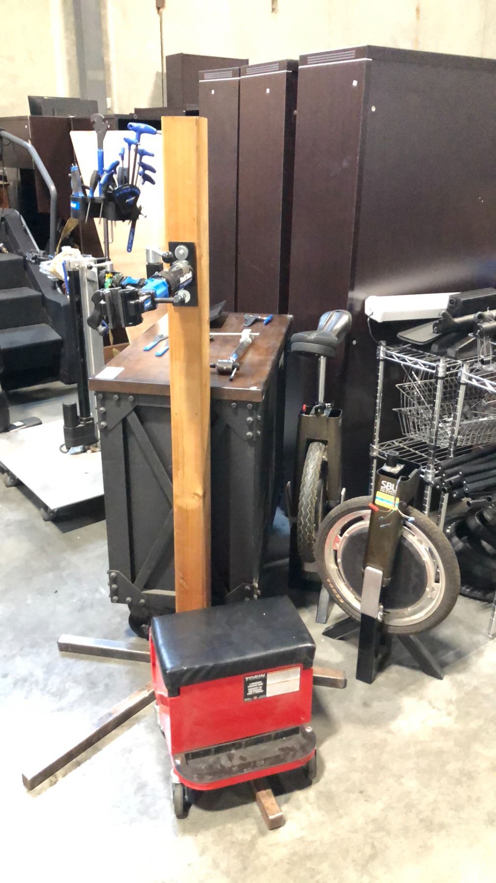 2 CUSTOM BIKE REPAIR STATIONS W/ TOOLS, INDUSTRIAL WOODEN/METAL MOBILE TOOLBOX, 2 UNICYCLE STANDS AND RED MINI TOOLBOX/SEAT