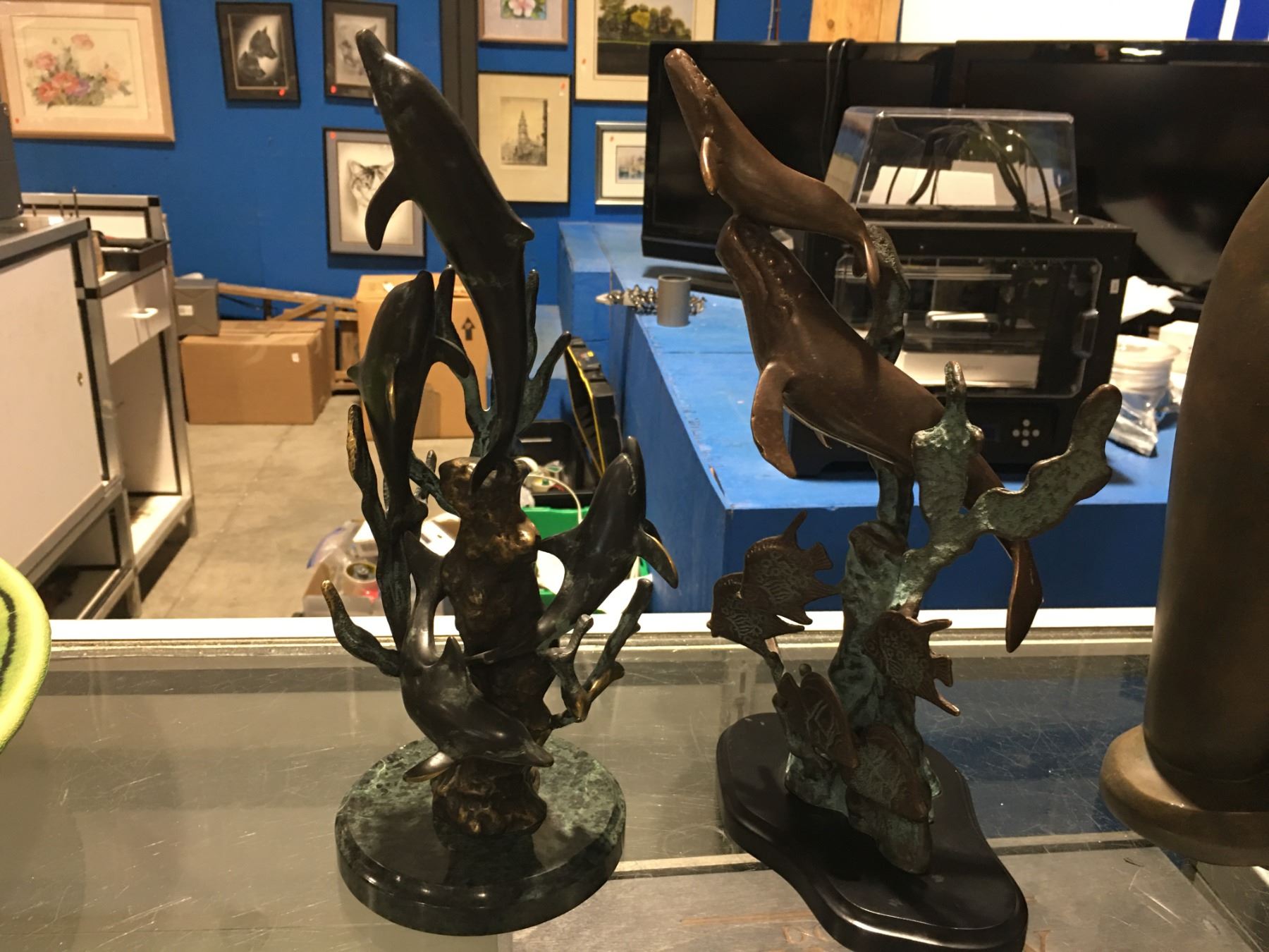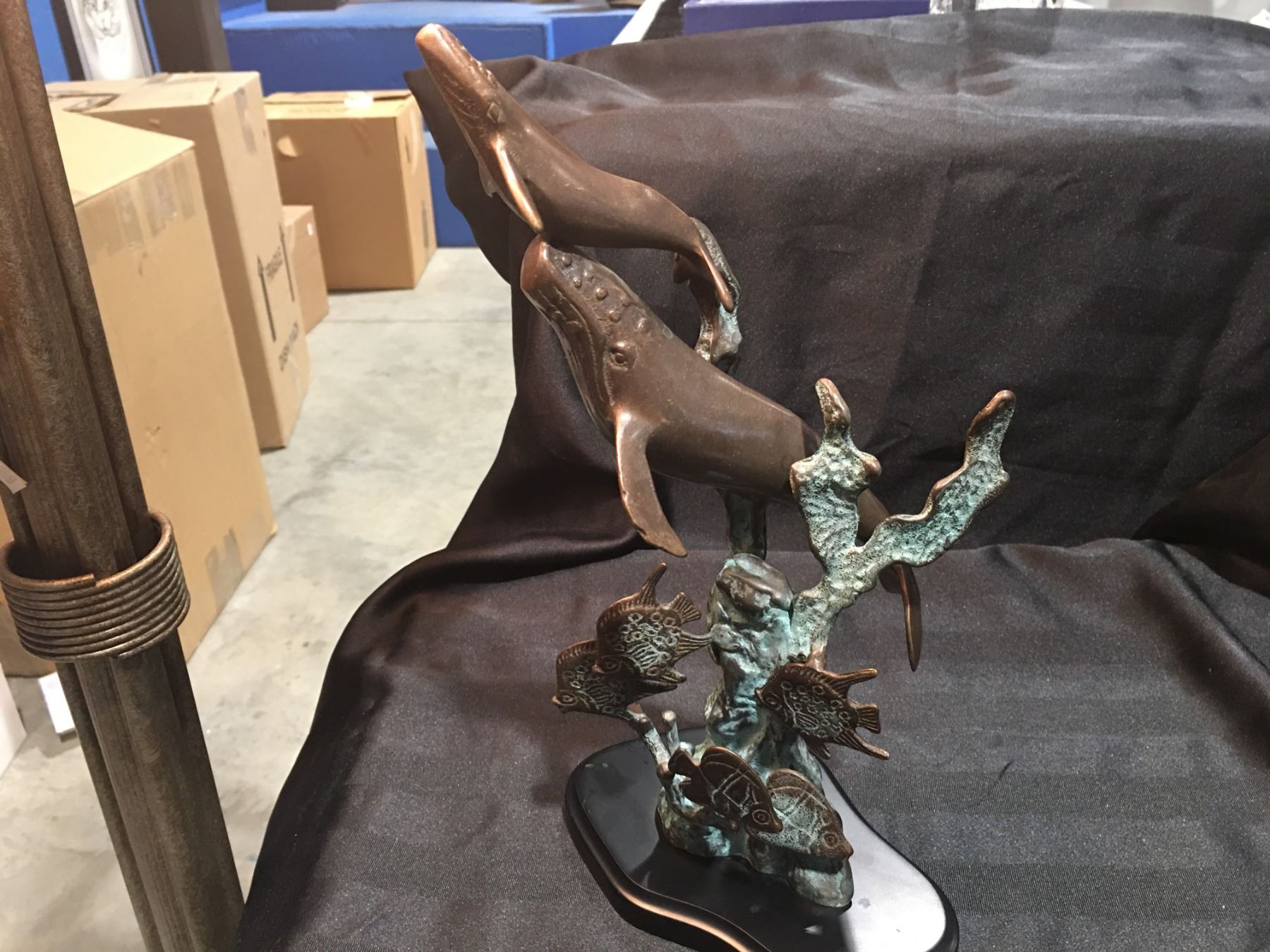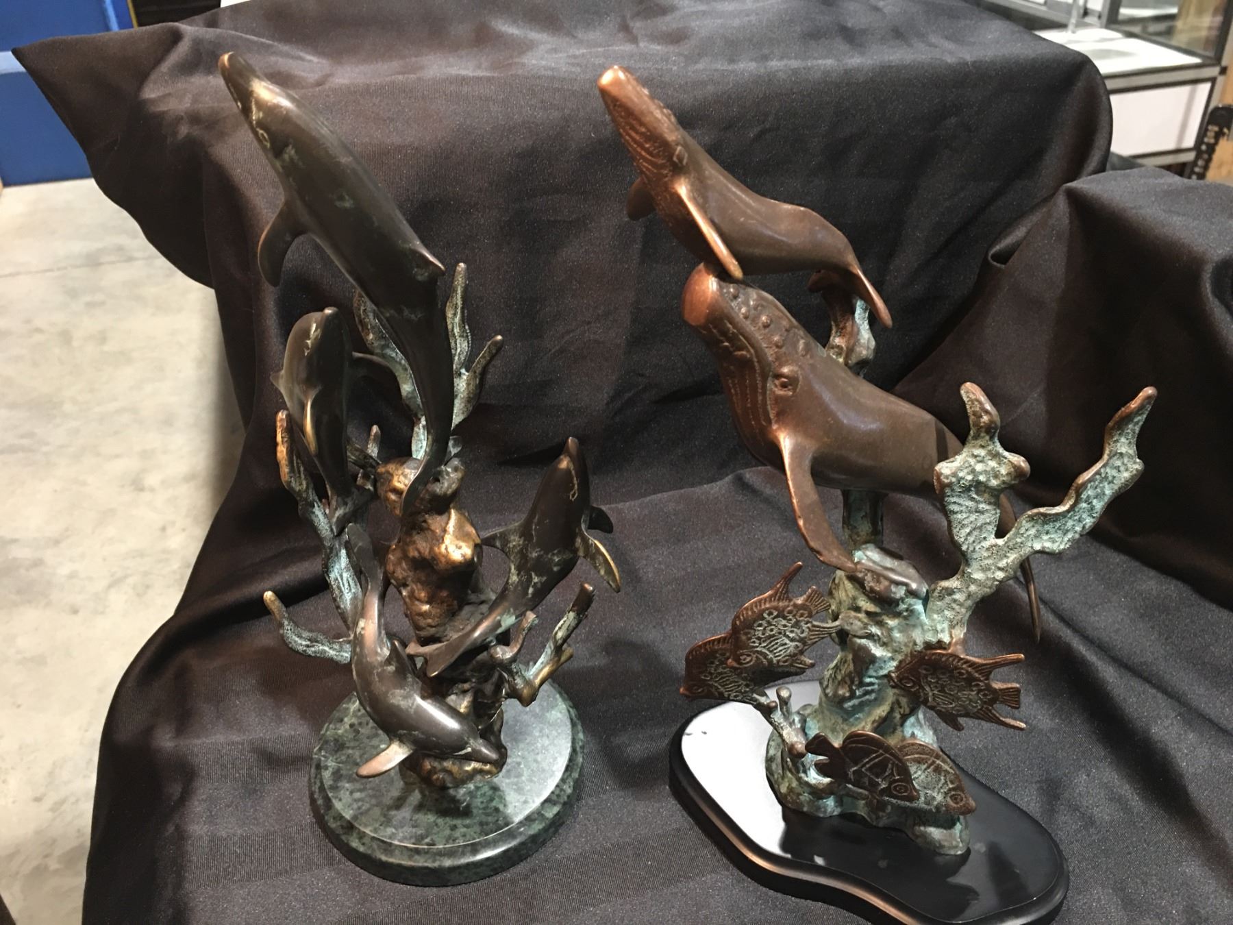 2 DECORATIVE METAL SCULPTED PIECES - GREY WHALES & DOLPHINS APPROX 13" TALL