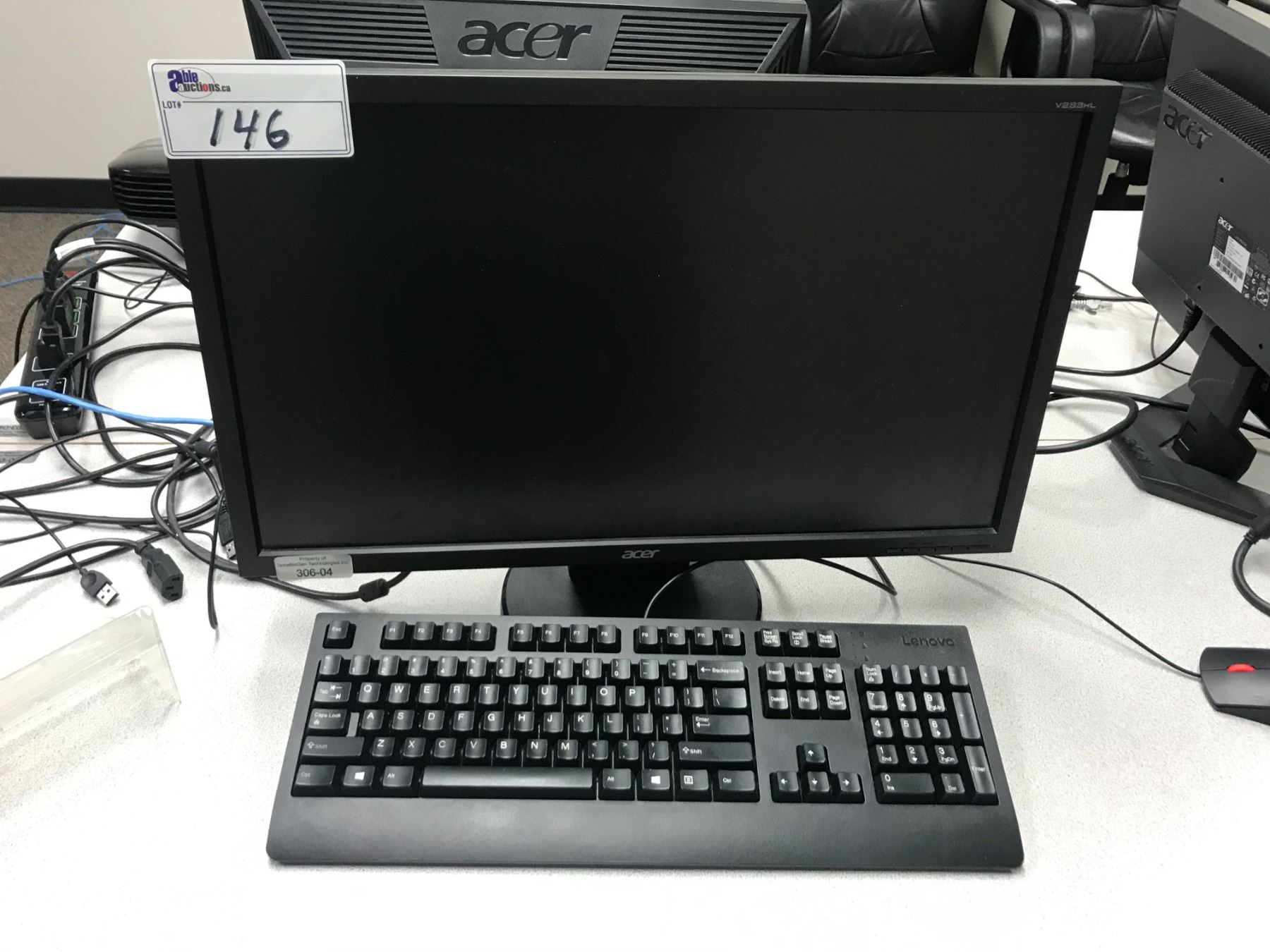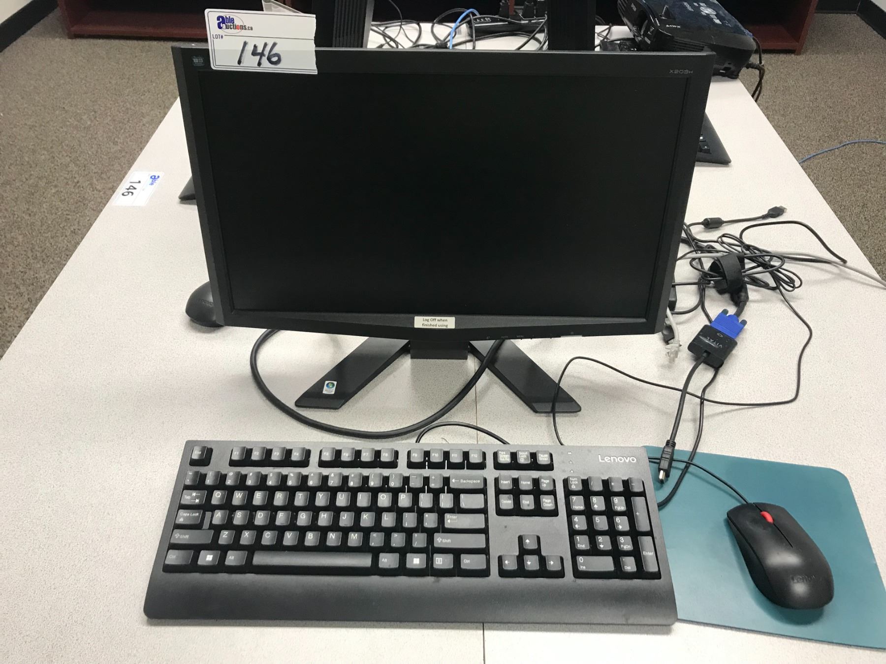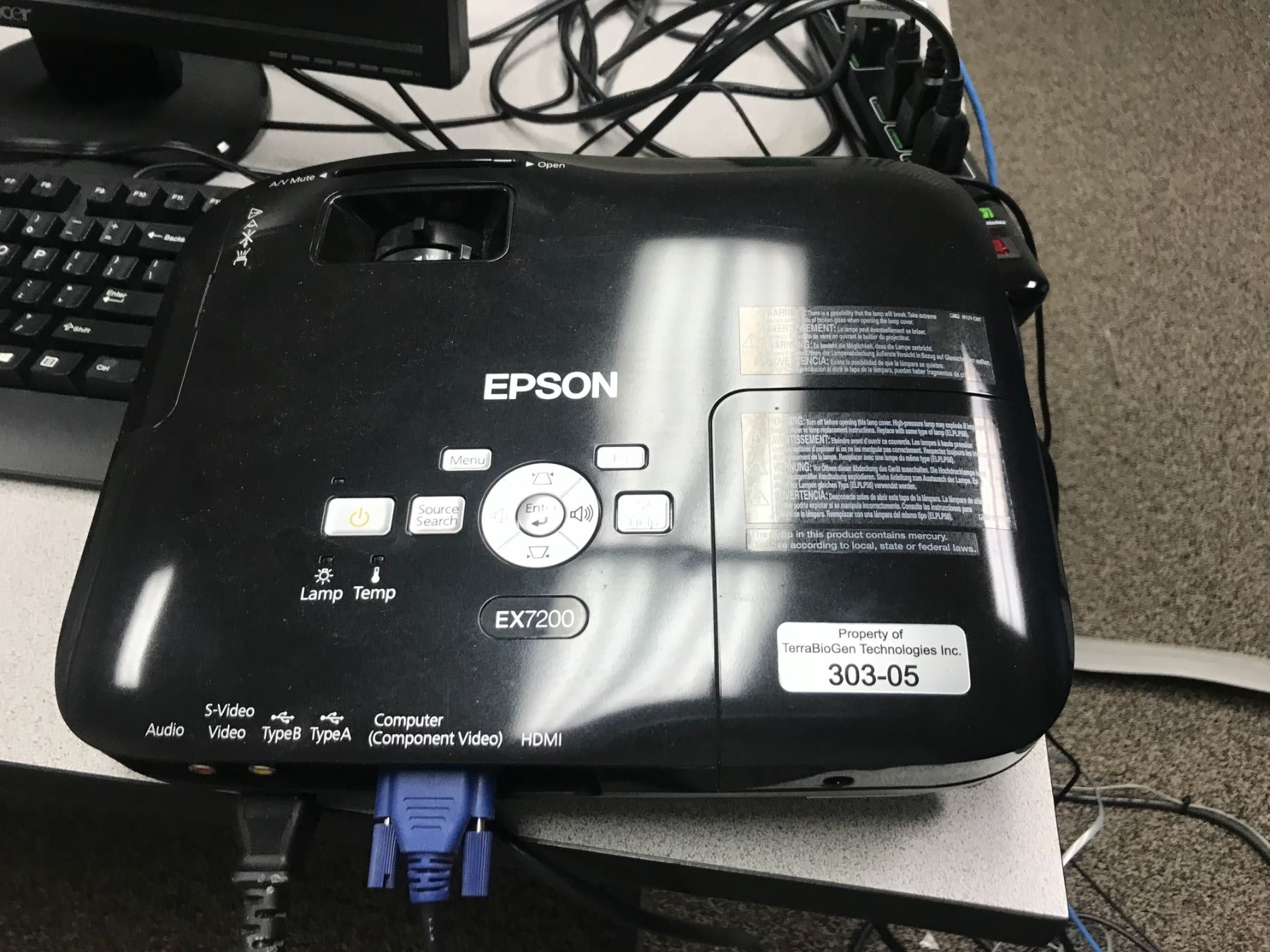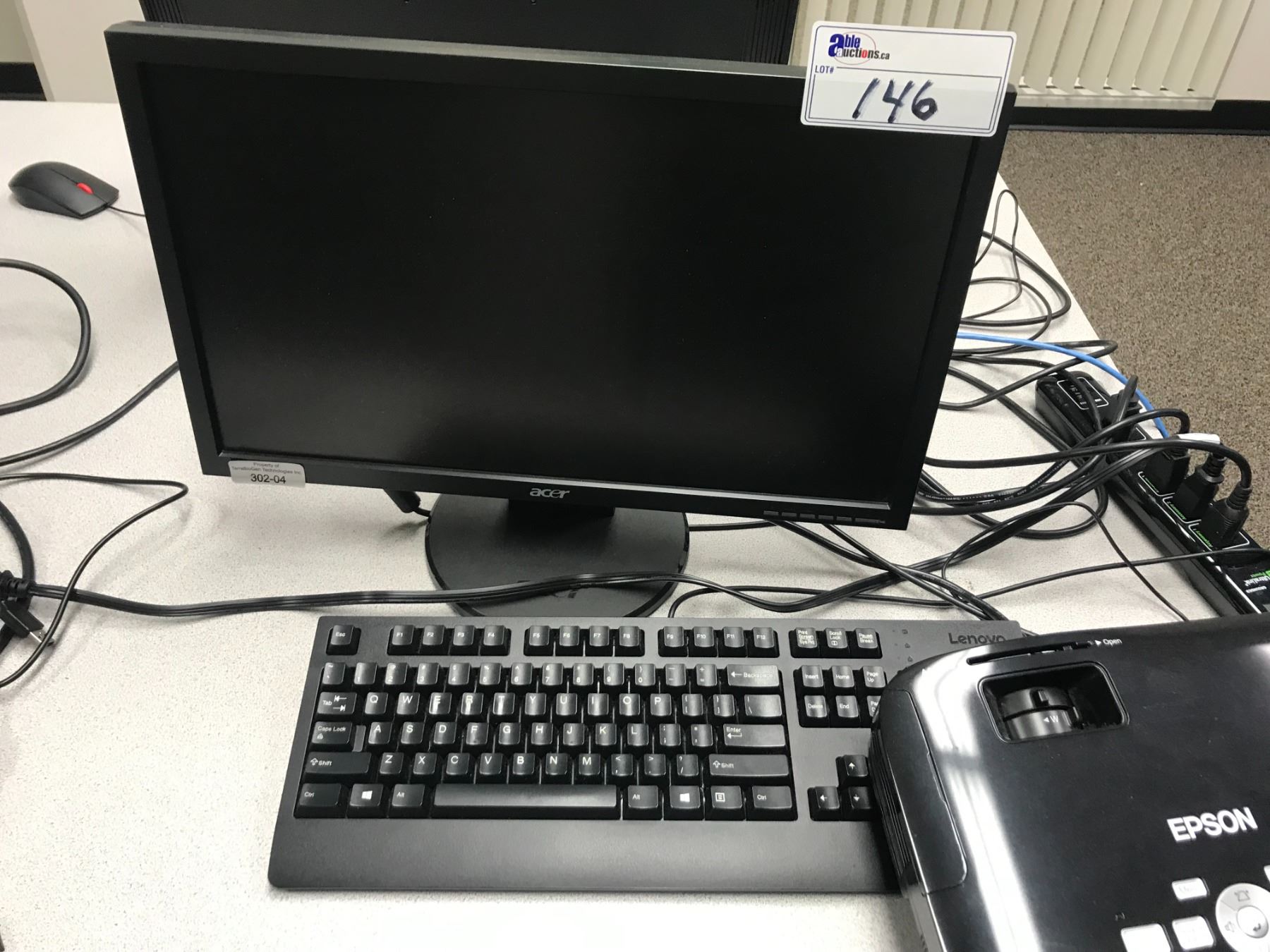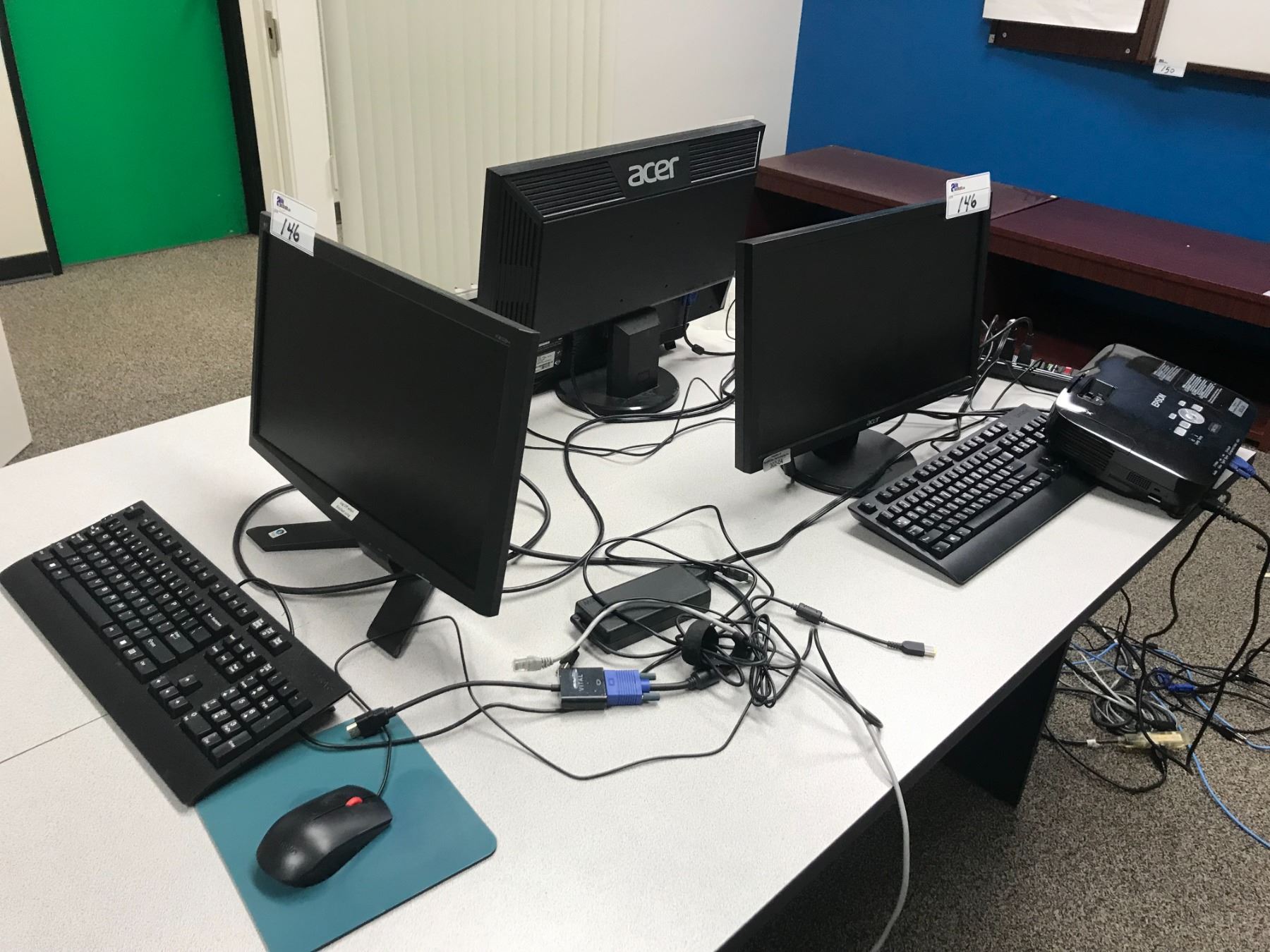 2 DESK RUN-OFFS, EPSON EX7200 MULTIMEDIA PROJECTOR, 3 COMPUTER MONITORS W/KEYBOARDS AND MOUSE