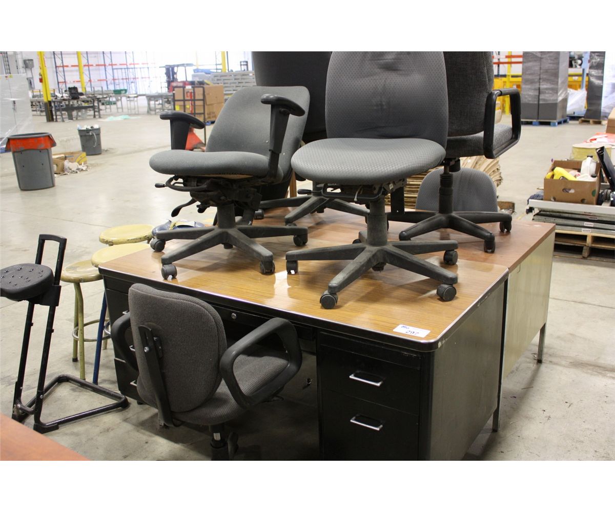 2 DESKS, ASSORTED OFFICE CHAIRS AND STOOLS