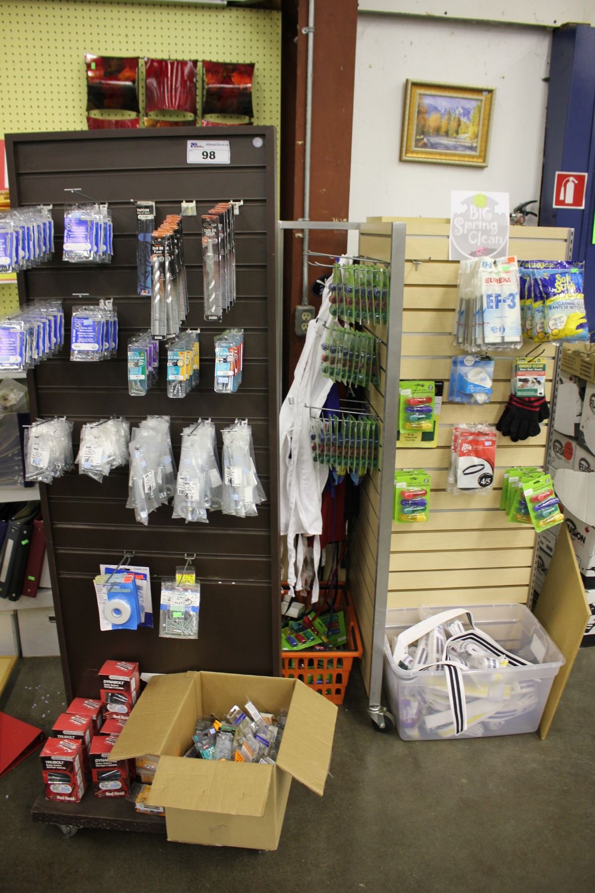 2 DISPLAY RACKS WITH ASSORTED HARDWARE, OUTDOOR STONE, AND MORE