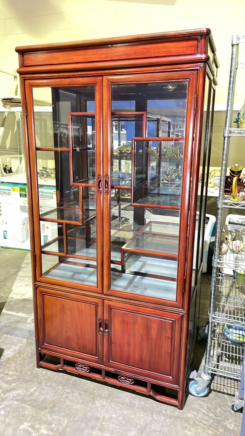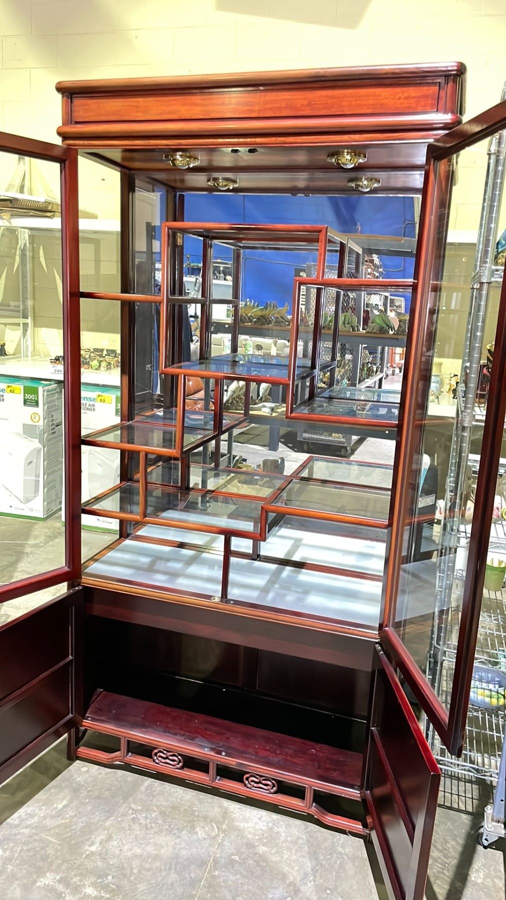 2 DOOR WOODEN DISPLAY CABINET WITH MULTIPLE GLASS SHELVES AND MIRROR BACK