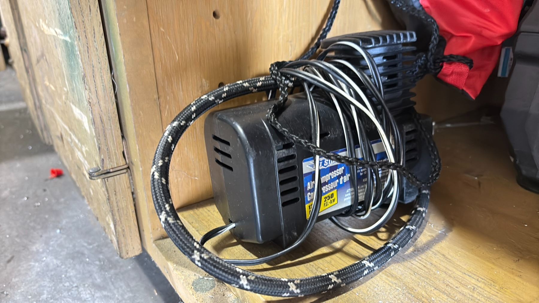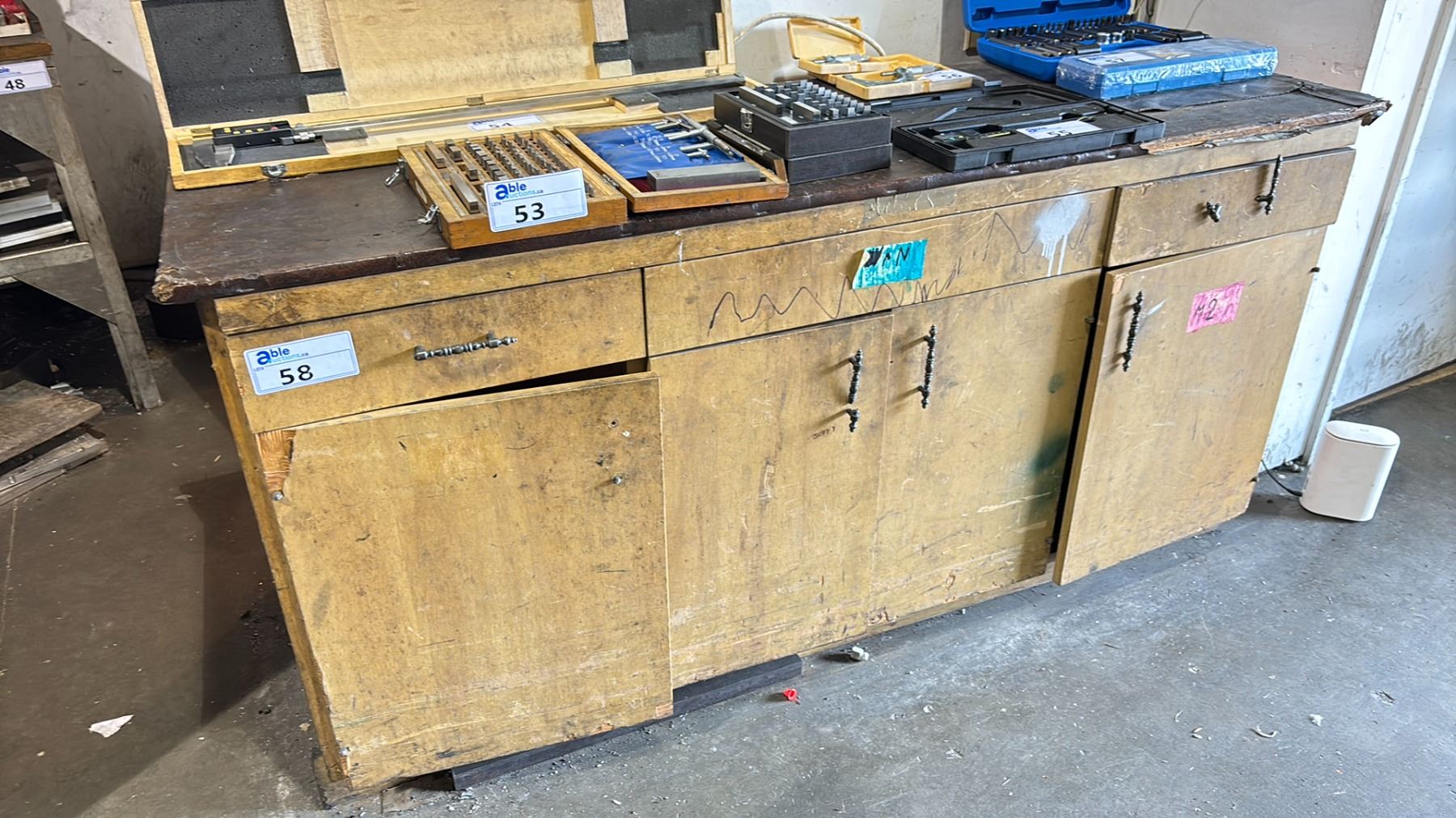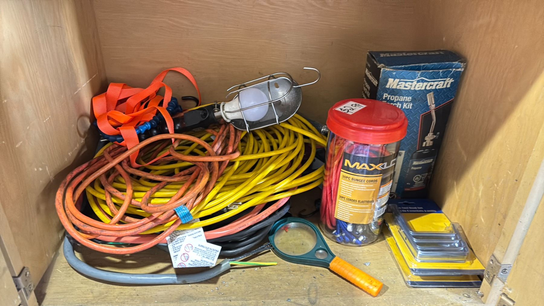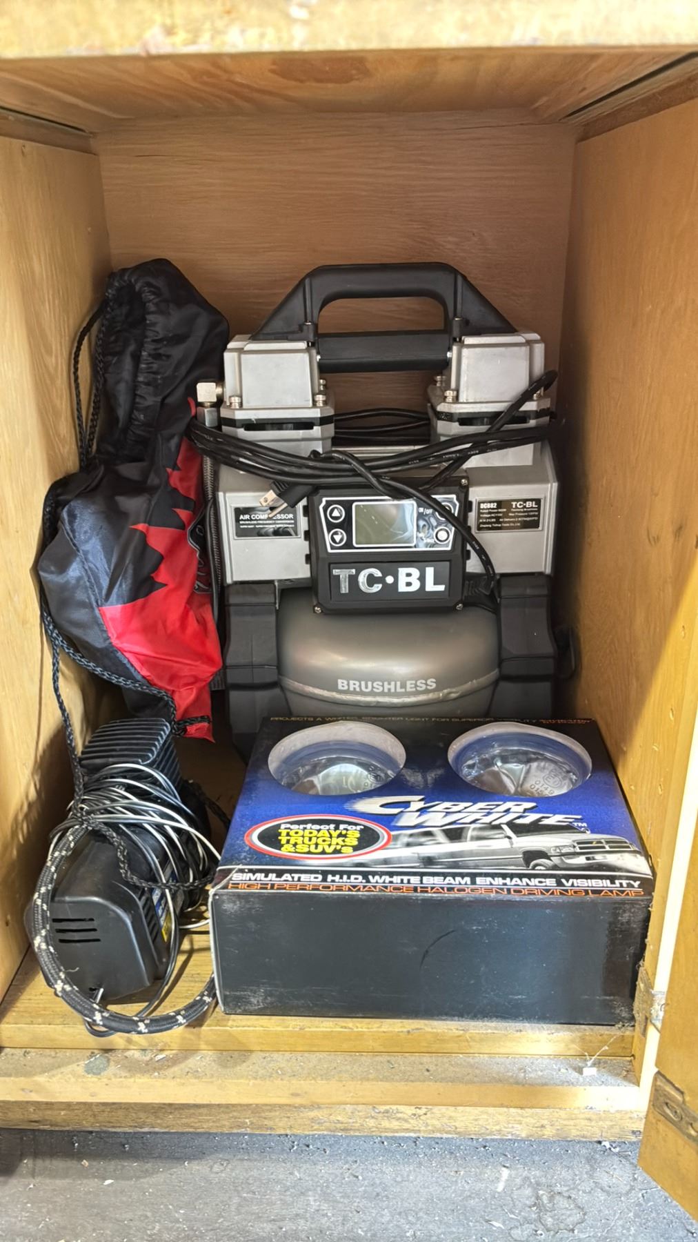 2 DRAWER 4 DOOR 64"W X 20"D 32"H WORK SURFACE WITH ASSORTED AIR COMPRESSOR, MINI COMPRESSOR, STRAPS, ELECTRICAL CABLES, JUMPER CABLES, HAND TOOLS & ASSORTED BELTS