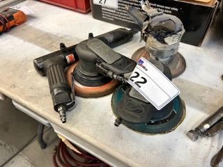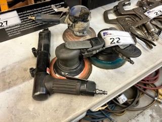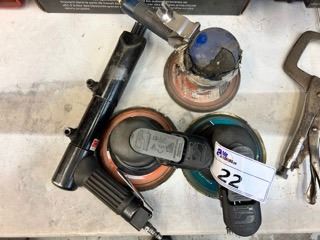 2 DYNABRADE PNEUMATIC ORBITAL PALM SANDERS, JET NS260P PNEUMATIC CHIPPER, & BLUE PNEUMATIC ORBITAL SANDER ( NEEDS REPAIRS )